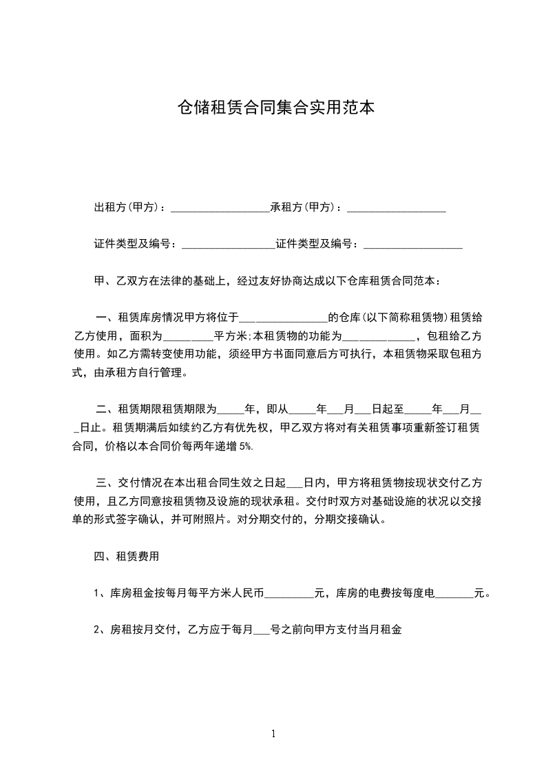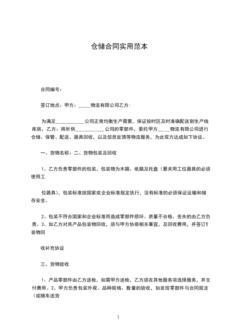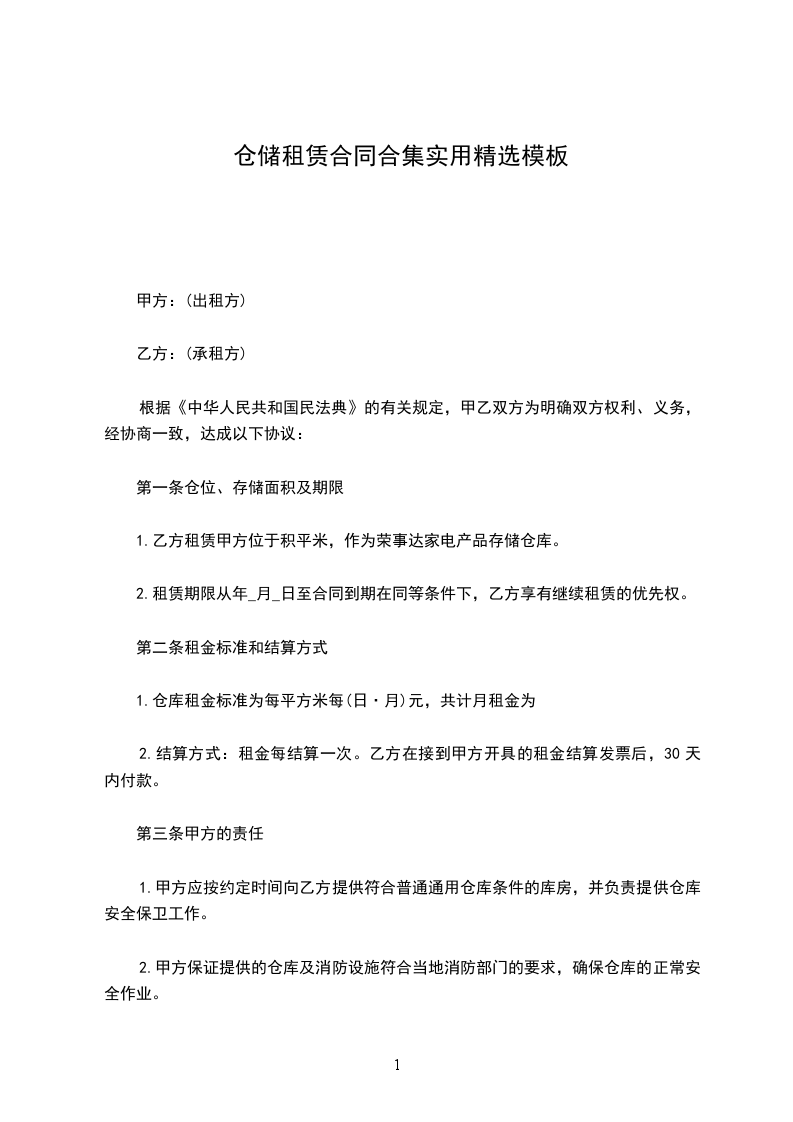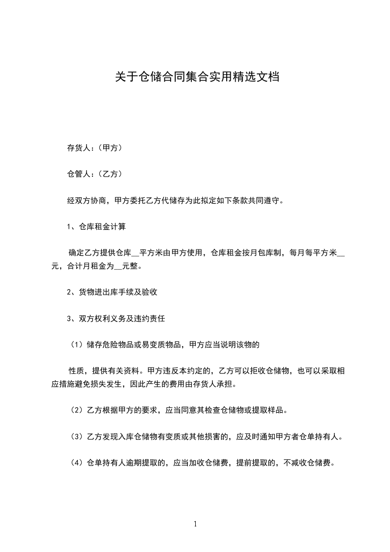 1.为了提高仓库使用率,确保物资安全,经协商,确定乙方提供仓库____平方米由甲方使用,仓库租金按月包库制,每月每平方米____元,合计月租金为_________元整。