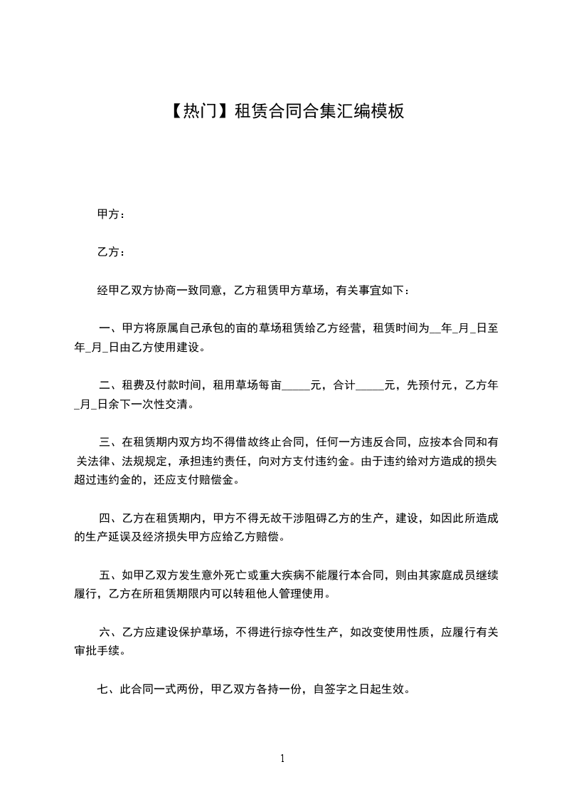 二、租费及付款时间,租用草场每亩_____元,合计_____元,先预付元,乙方年_月_日余下一次性交清。