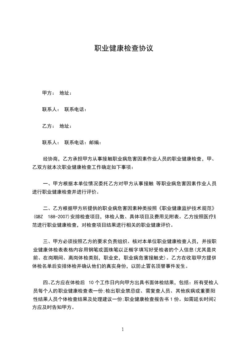 二、乙方根据甲方所提供的职业病危害因素种类按照《职业健康监护技术规范》(GBZ 188-2007)安排检查项目,体检人数、具体项目及费用见附表。乙方按照医疗规范进行职业健康检查,对检查项目结果进行相关的职业健康评价。