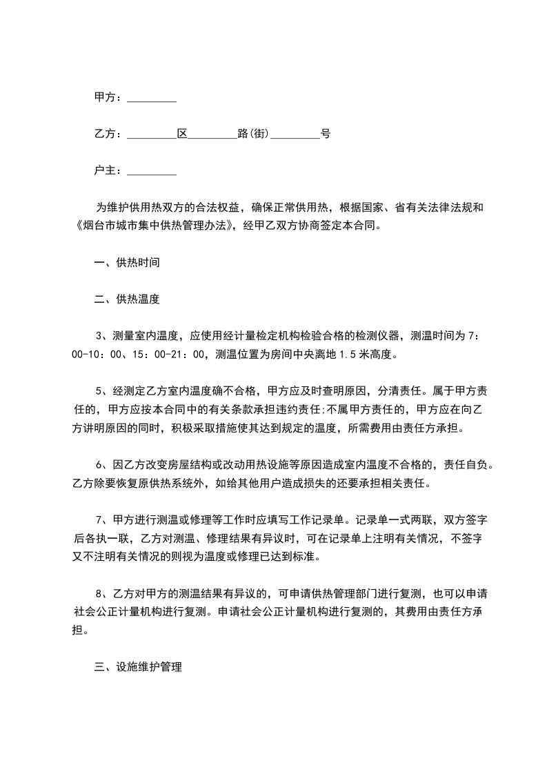 5、经测定乙方室内温度确不合格,甲方应及时查明原因,分清责任。属于甲方责任的,甲方应按本合同中的有关条款承担违约责任;不属甲方责任的,甲方应在向乙方讲明原因的同时,积极采取措施使其达到规定的温度,所需费用由责任方承担。