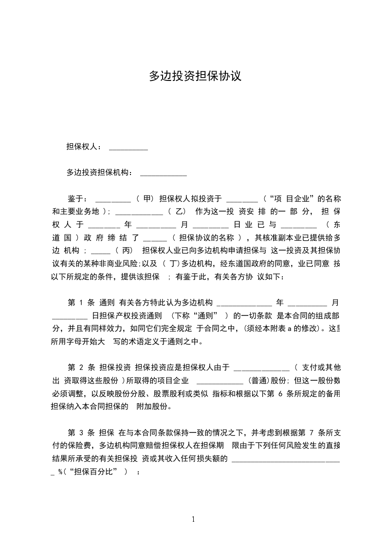 鉴于: _________ ( 甲) 担保权人拟投资于 ________ (“项 目企业”的名称和主要业务地 ); ____________ ( 乙) 作为这一投 资安 排 的一 部 分, 担 保权 人 于 ________ 年 __________ 月 _________ 日 业 已 与 _________ ( 东 道 国 ) 政 府 缔 结 了 ______ ( 担保协议的名称 ) ,其核准副本业已提供给多边 机构 ; _____ ( 丙) 担保权人业已向多边机构申请担保与 这一投资及其担保协议有关的某种非商业风险;以及 ( 丁)多边机构,经东道国政府的同意,业已同意 按以下所规定的条件,提供该担保 ; 有鉴于此,有关各方协 议如下:
