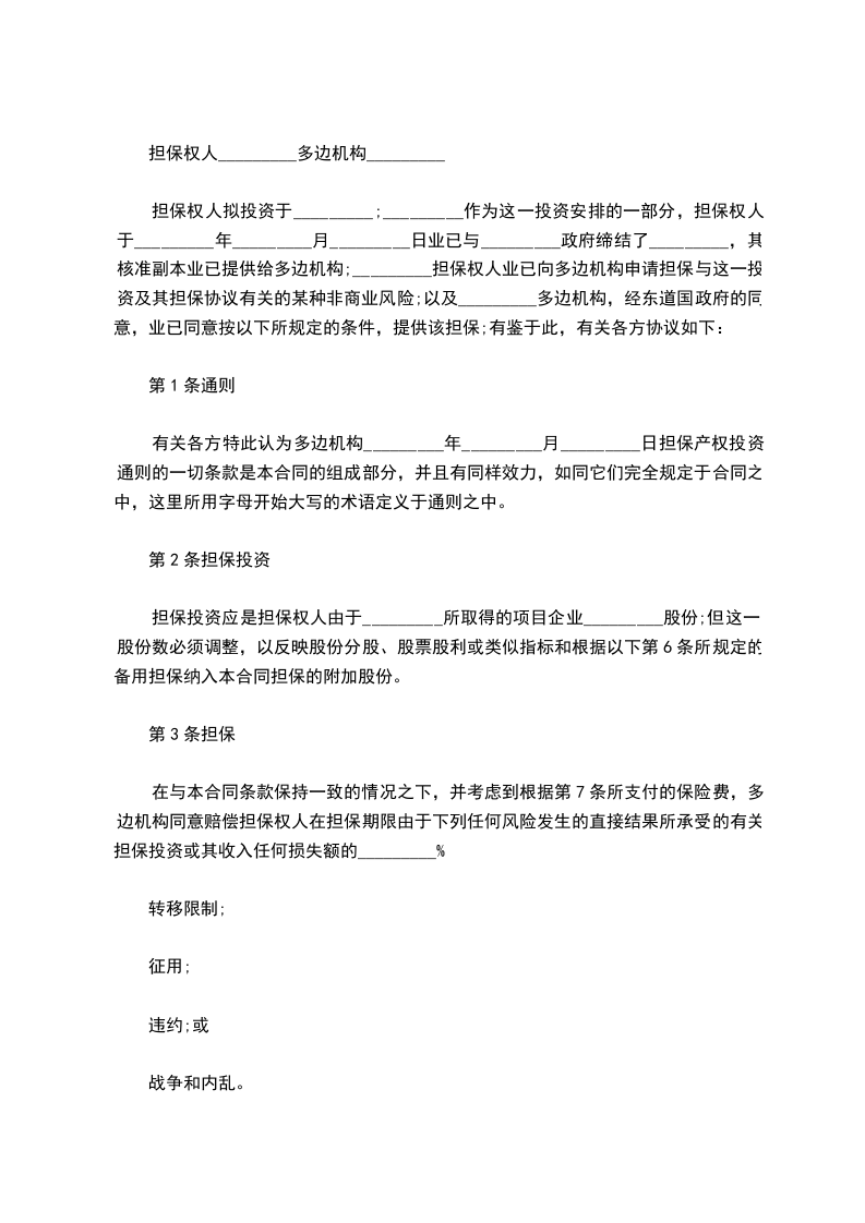 第 3 条 担保 在与本合同条款保持一致的情况之下,并考虑到根据第 7 条所支付的保险费,多边机构同意赔偿担保权人在担保期 限由于下列任何风险发生的直接结果所承受的有关担保投 资或其收入任何损失额的 _____________________________ %(“担保百分比” ) :