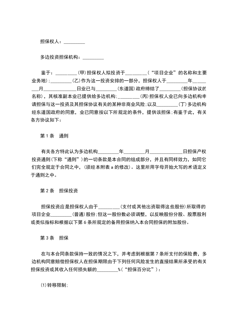 鉴于:_________(甲)担保权人拟投资于_________(“项目企业”的名称和主要业务地);_________(乙)作为这一投资安排的一部分,担保权人于______年_____月_____日业已与________(东道国)政府缔结了_______(担保协议的名称),其核准副本业已提供给多边机构;_________(丙)担保权人业已向多边机构申请担保与这一投资及其担保协议有关的某种非商业风险;以及_______(丁)多边机构,经东道国政府的同意,业已同意按以下所规定的条件,提供该担保;有鉴于此,有关各方协议如下:
