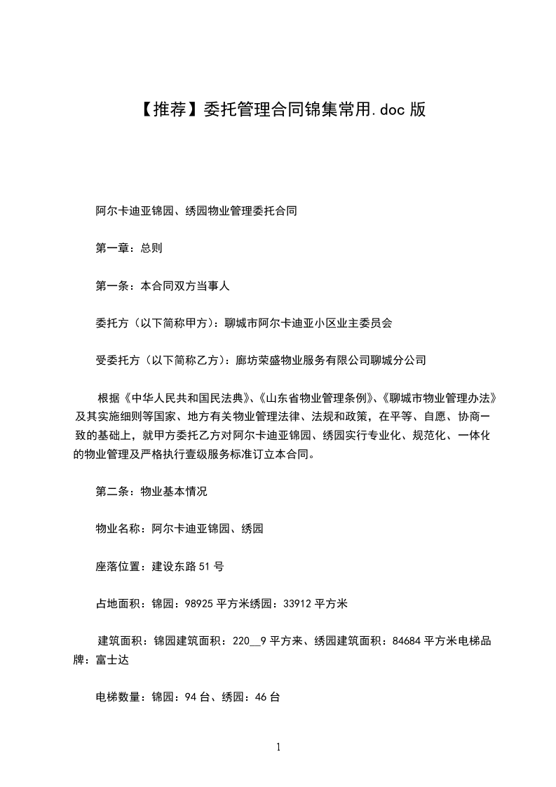 根据《中华人民共和国民法典》、《山东省物业管理条例》、《聊城市物业管理办法》及其实施细则等国家、地方有关物业管理法律、法规和政策,在平等、自愿、协商一致的基础上,就甲方委托乙方对阿尔卡迪亚锦园、绣园实行专业化、规范化、一体化的物业管理及严格执行壹级服务标准订立本合同。