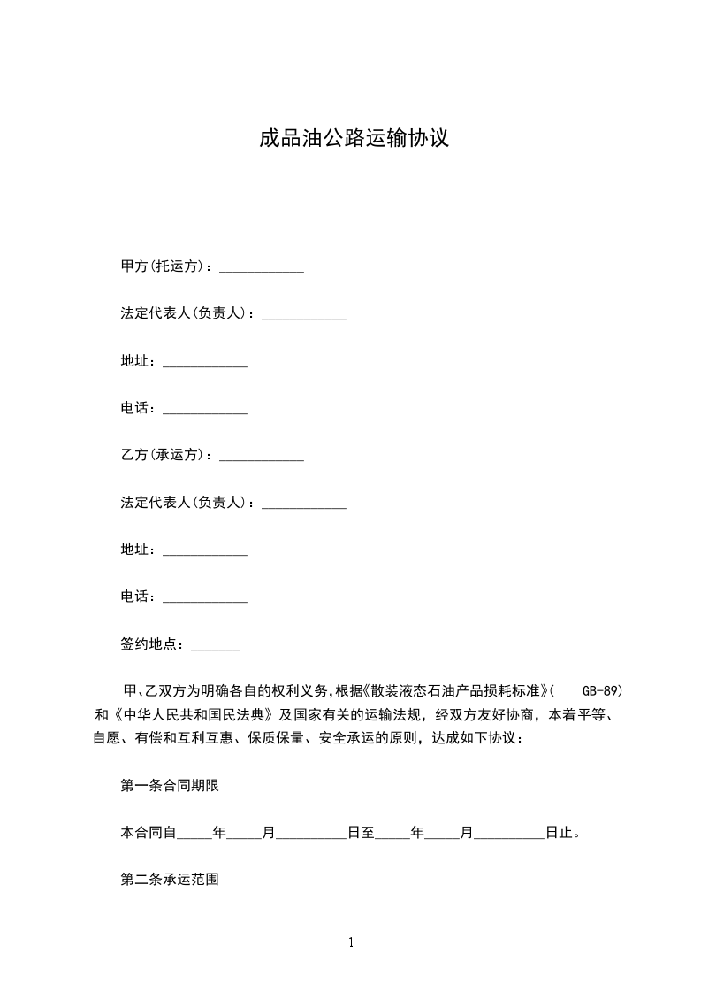甲、乙双方为明确各自的权利义务,根据《散装液态石油产品损耗标准》(GB11085-89)和《中华人民共和国民法典》及国家有关的运输法规,经双方友好协商,本着平等、自愿、有偿和互利互惠、保质保量、安全承运的原则,达成如下协议: