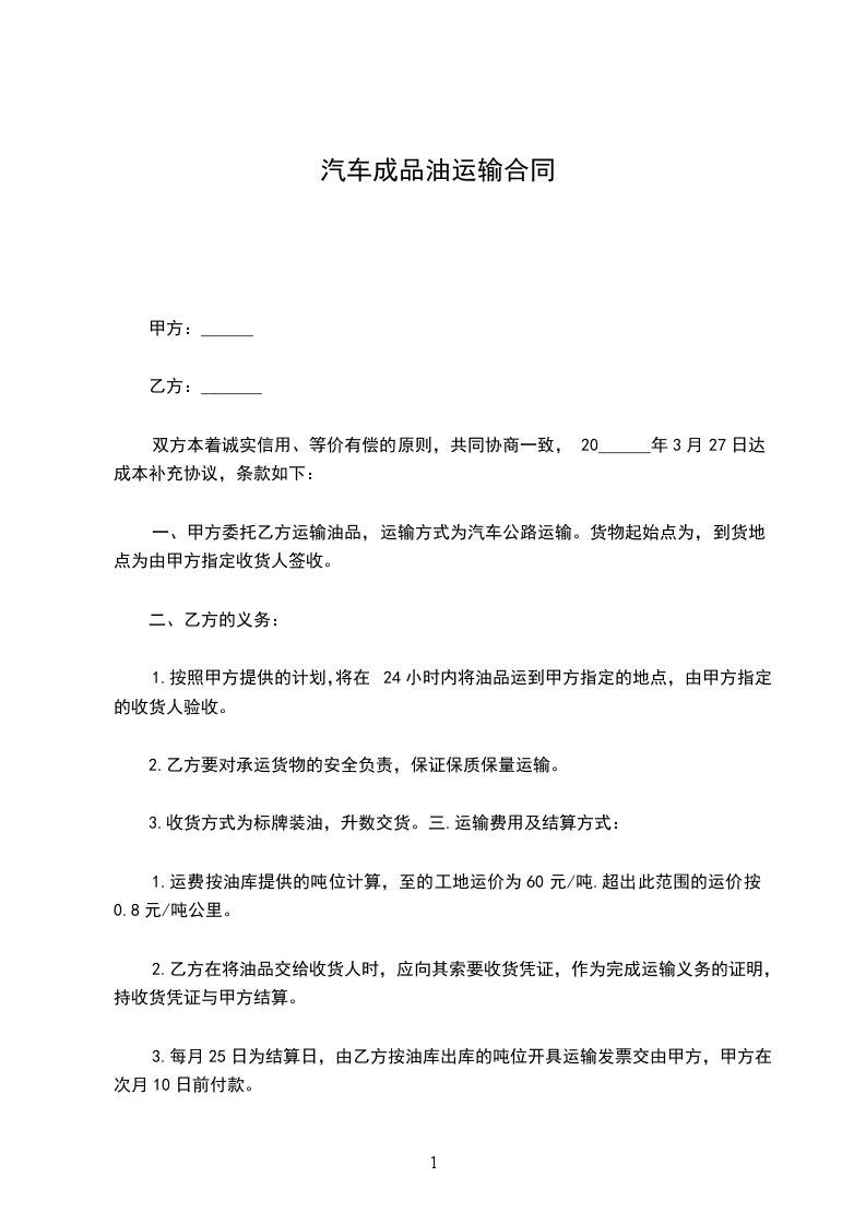 甲乙双方经友好协商,就乙方车辆为甲方运送油品一事达成如下协议: