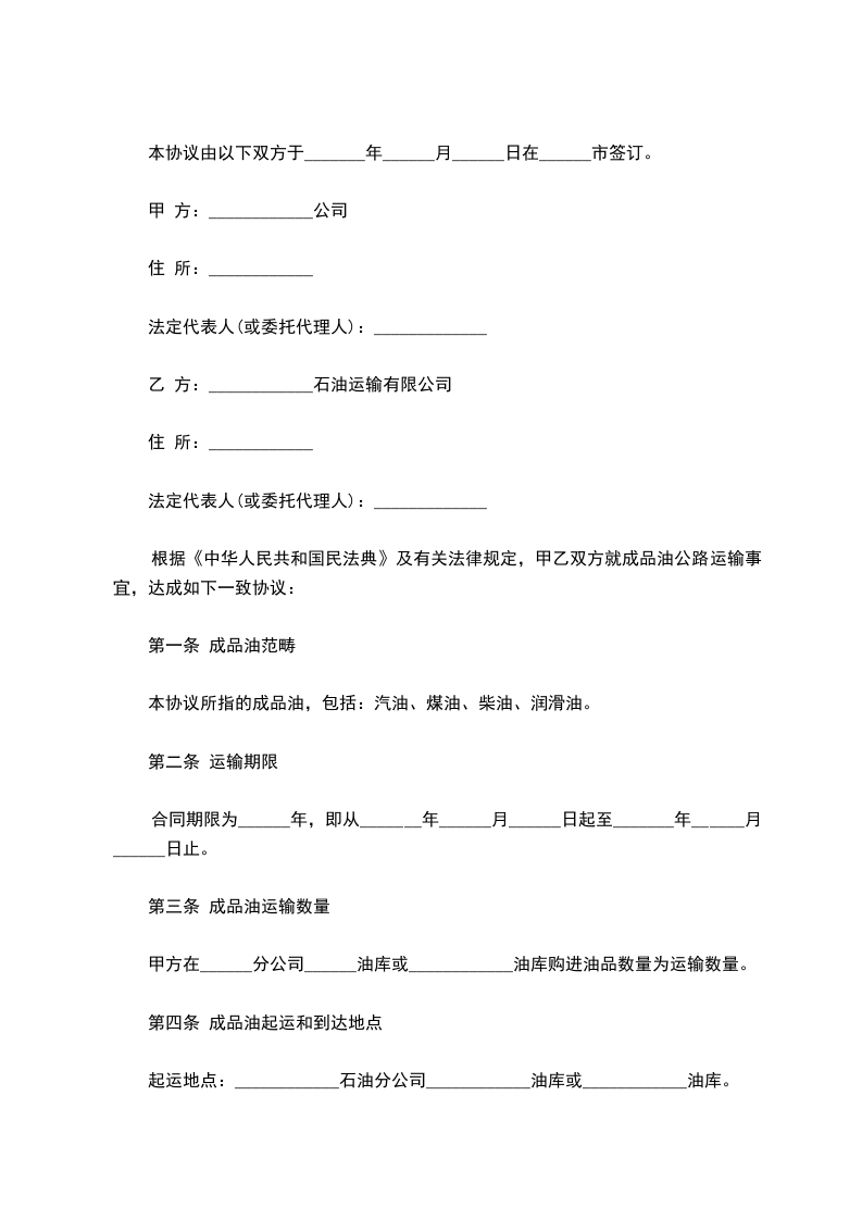 一、甲方委托乙方运输油品,运输方式为汽车公路运输。货物起始点为______,到货地点为______由甲方指定收货人签收。