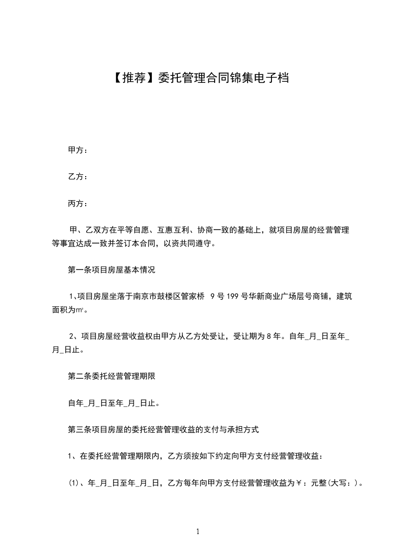 (1)、年_月_日至年_月_日,乙方每年向甲方支付经营管理收益为¥:元整(大写:)。