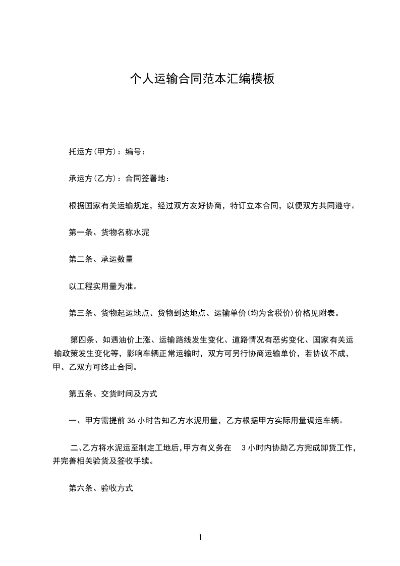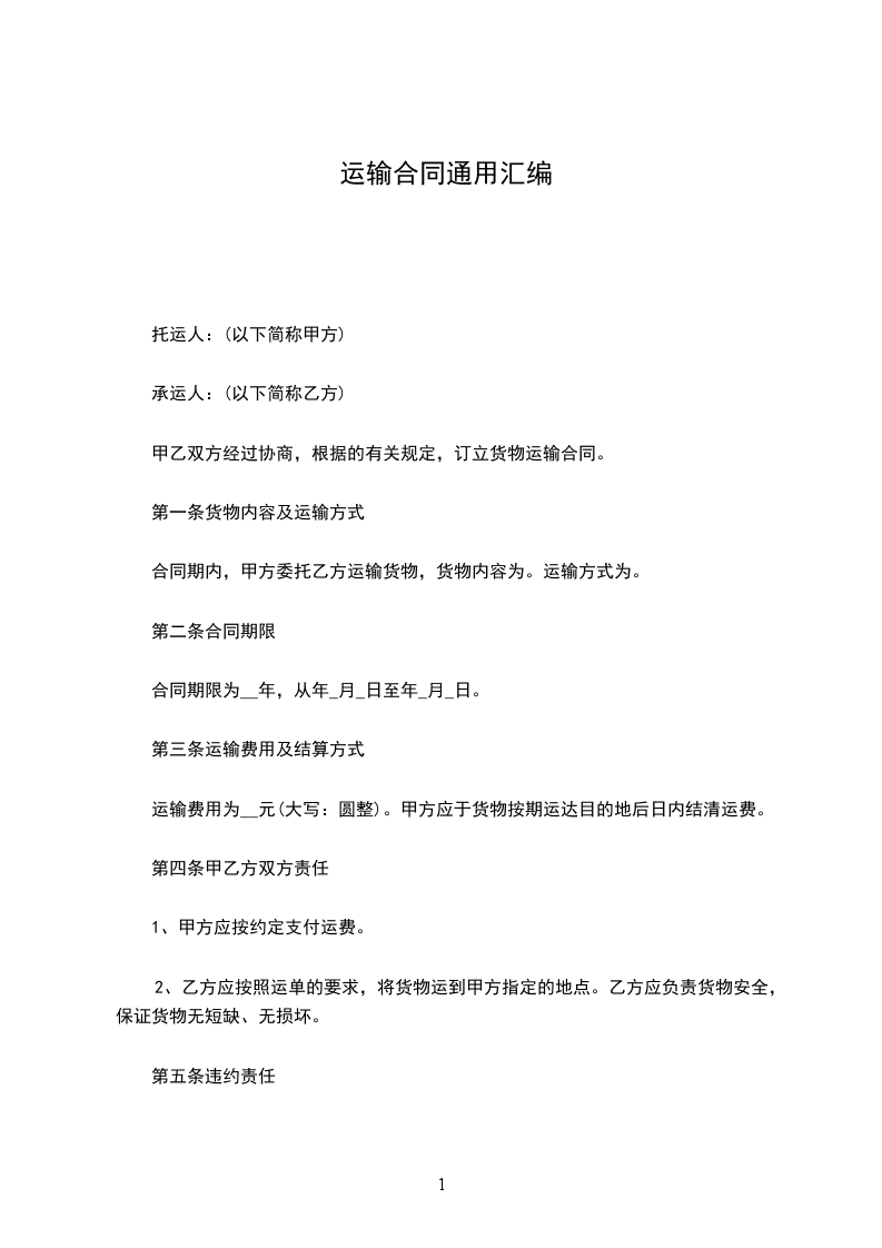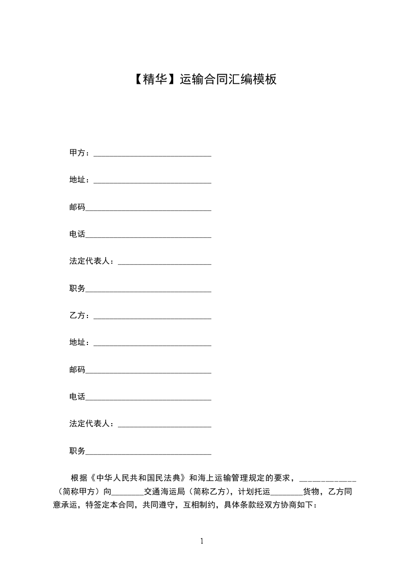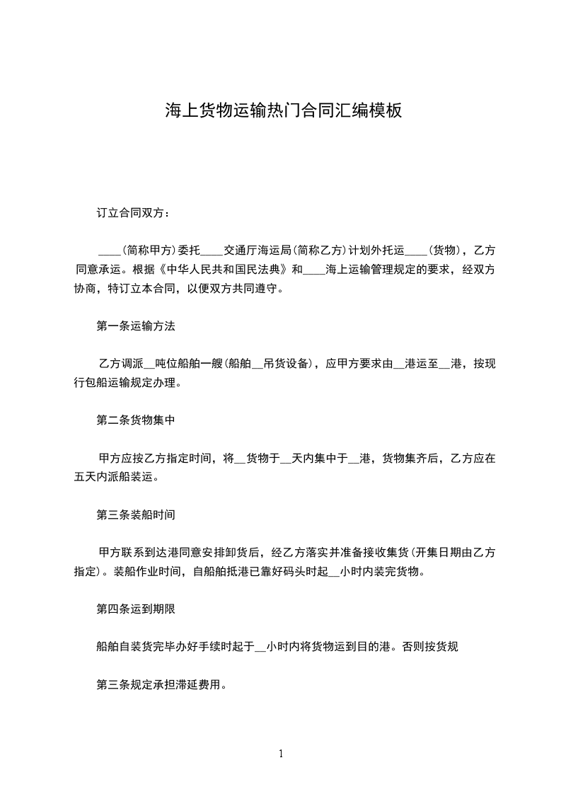 根据《中华人民共和国民法典》和海上运输管理规定的要求,_____________(简称甲方)向________交通海运局(简称乙方),计划托运________货物,乙方同意承运,特签定本合同,共同遵守,互相制约,具体条款经双方协商如下: