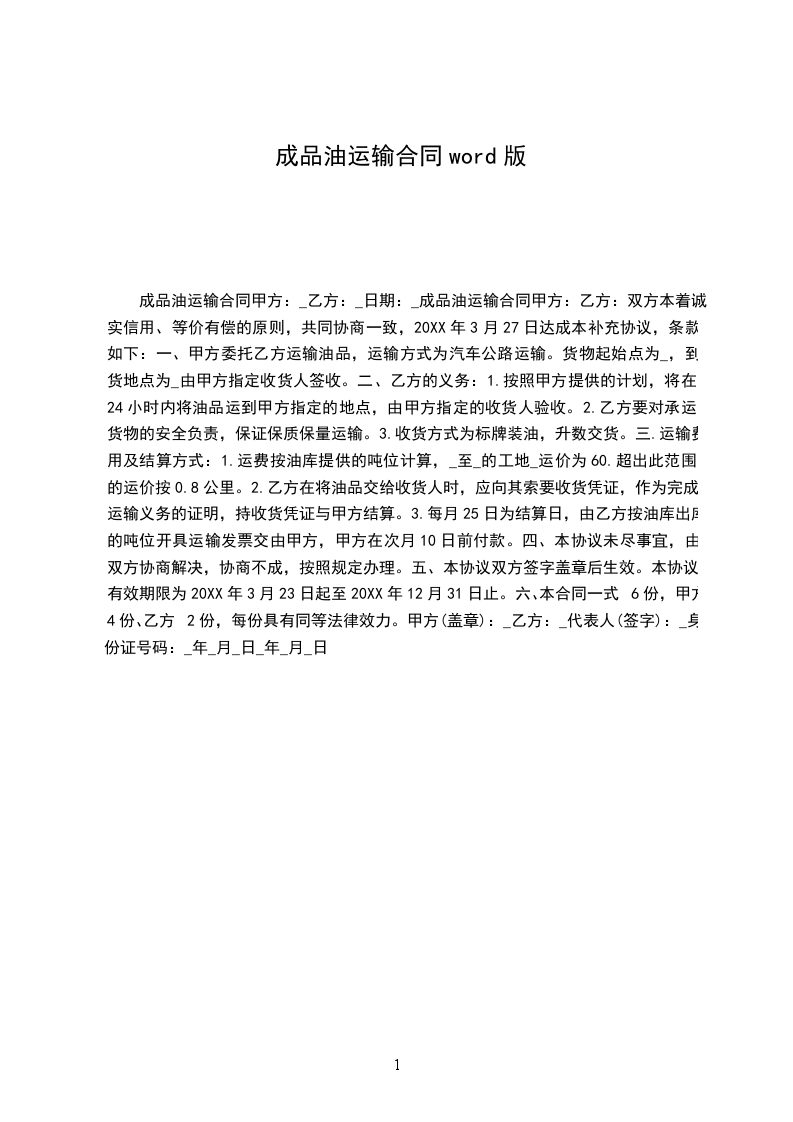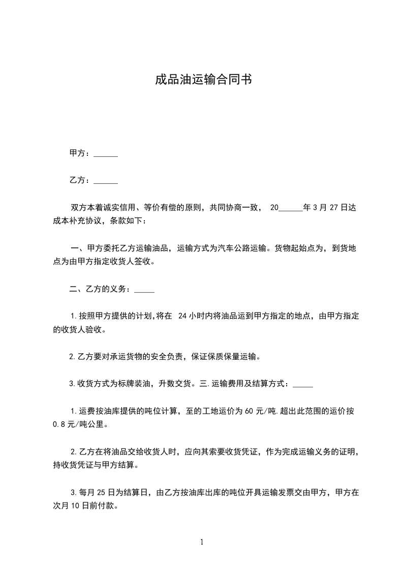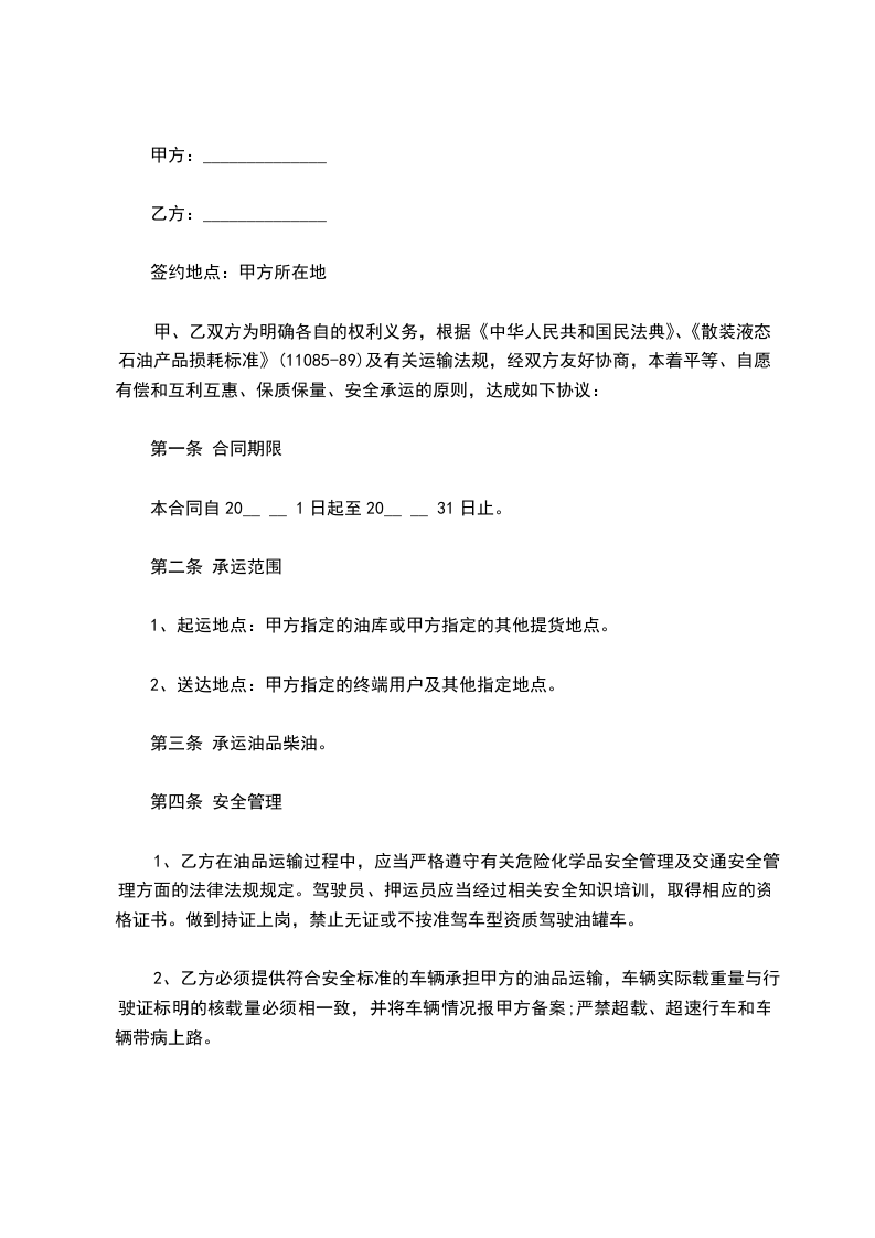 一、甲方委托乙方运输油品,运输方式为汽车公路运输。货物起始点为______,到货地点为______由甲方指定收货人签收。