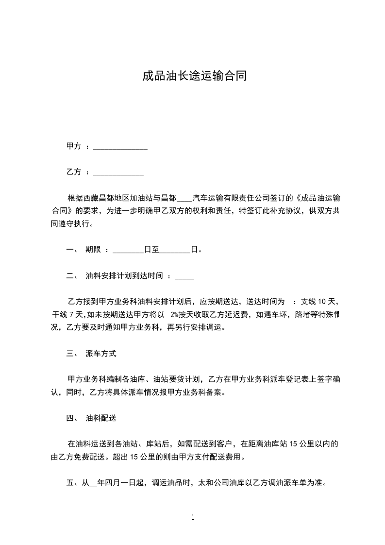 1、起运地点:甲方指定的油库或甲方指定的提货地点。