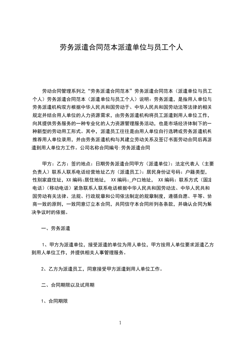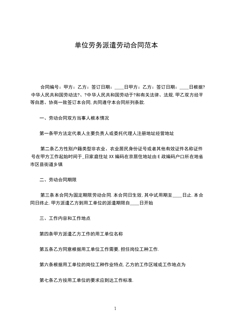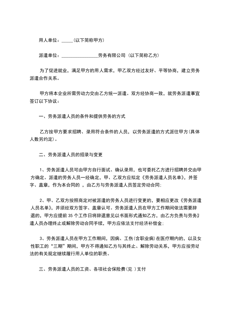 (一)本协议签订时,由乙方派往甲方的派遣员工共_____人。在本协议履行期间派遣员工数量变更的,以实际人员数量为准。