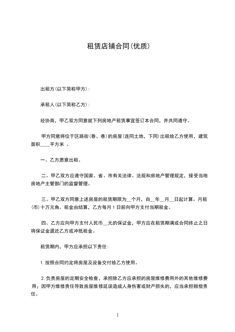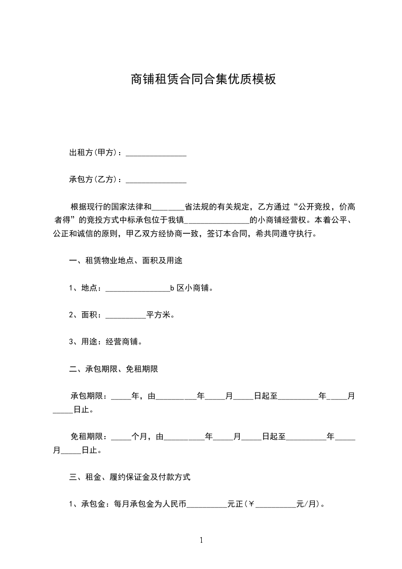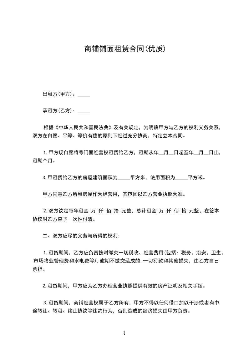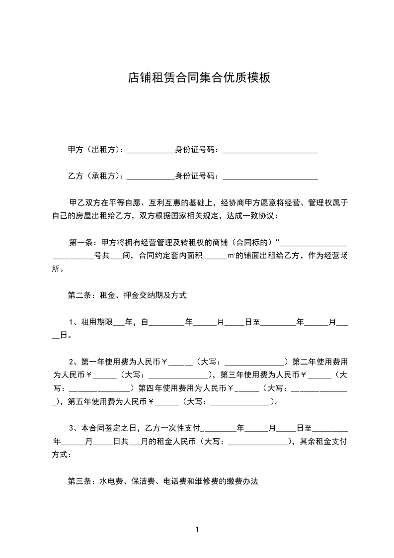 第一条:甲方将拥有经营管理及转租权的商铺(合同标的)“___________________________号共___间,合同约定套内面积______㎡的铺面出租给乙方,作为经营场所。