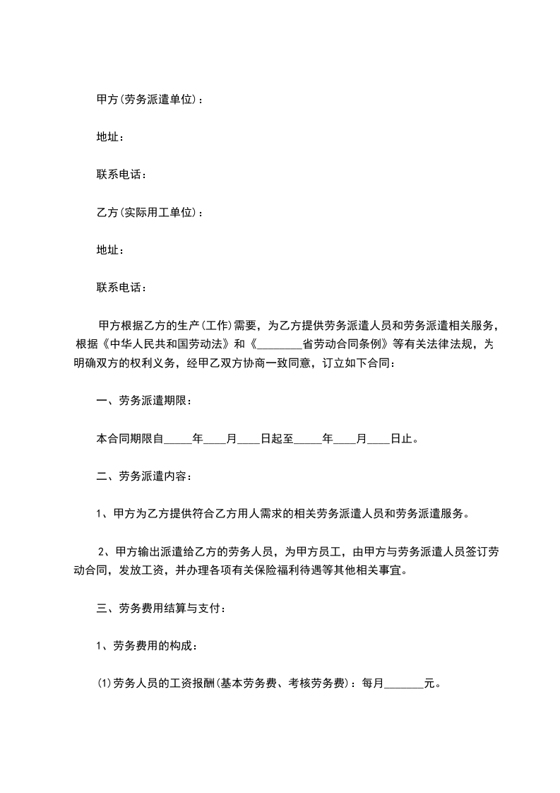 甲方根据乙方的生产(工作)需要,为乙方提供劳务派遣人员和劳务派遣相关服务,根据《中华人民共和国劳动法》和《________省劳动合同条例》等有关法律法规,为明确双方的权利义务,经甲乙双方协商一致同意,订立如下合同: