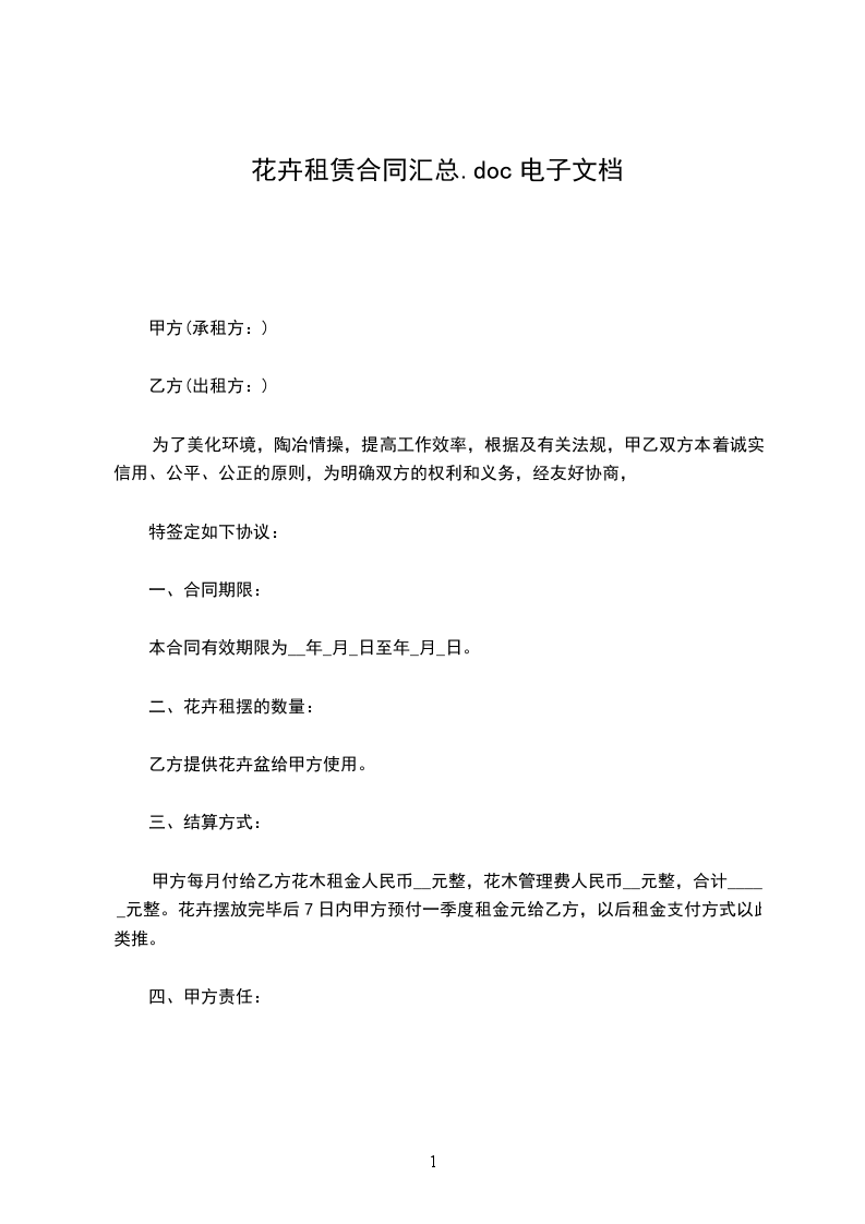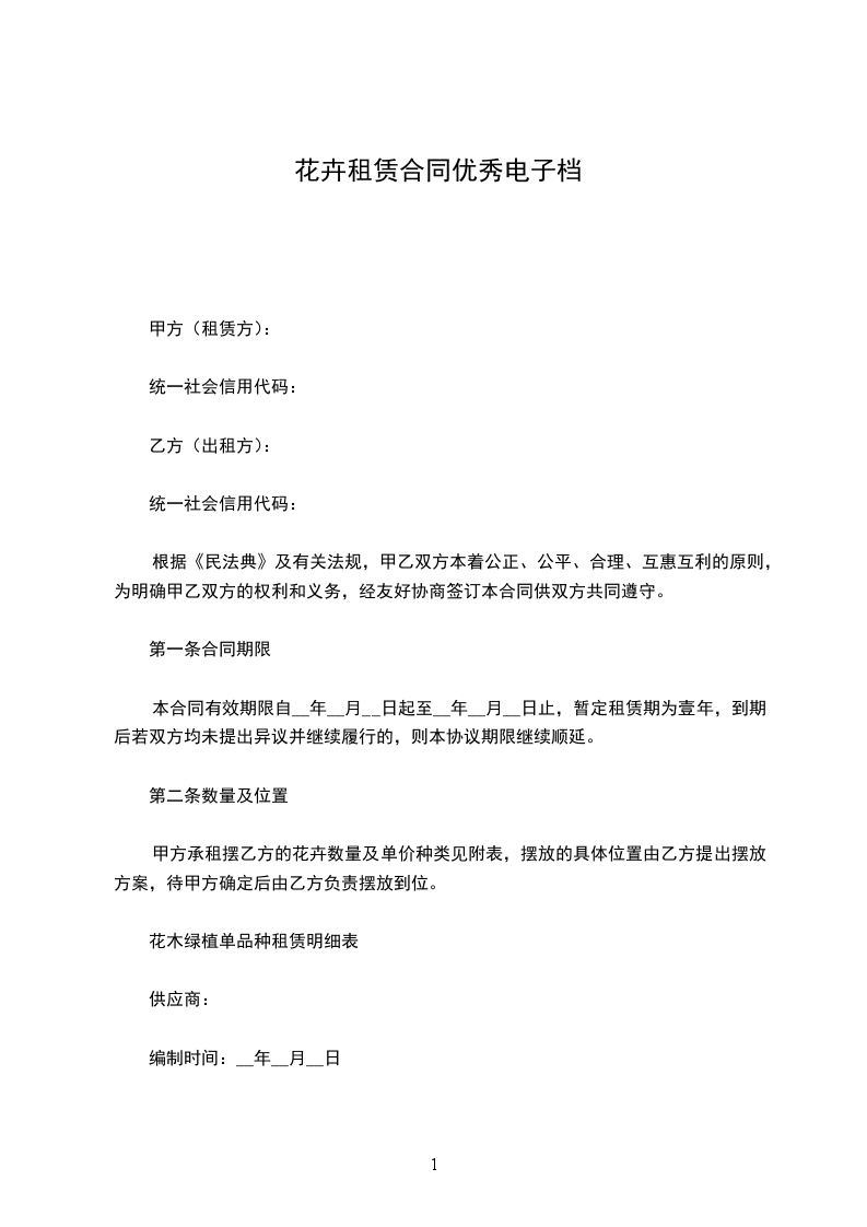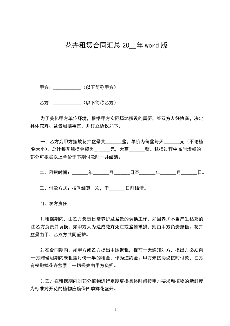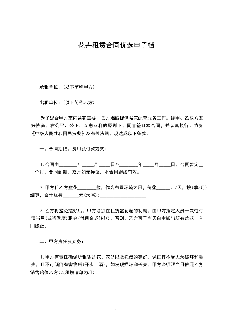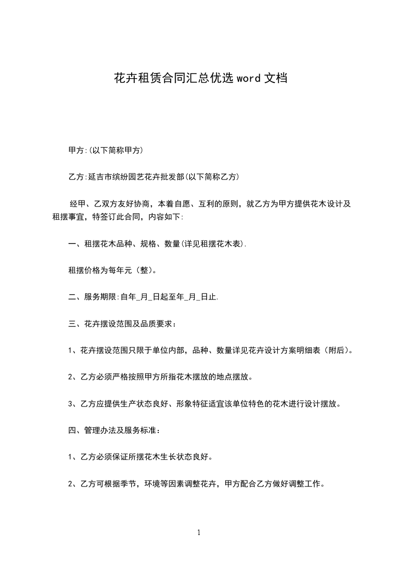 1、合同一经签订即行生效。甲、乙双方要严格遵守合同条款,不得无故更改。甲、乙双方如单方违约提前终止合同,需付对方违约金,违约金相当于一个月的花卉租金。