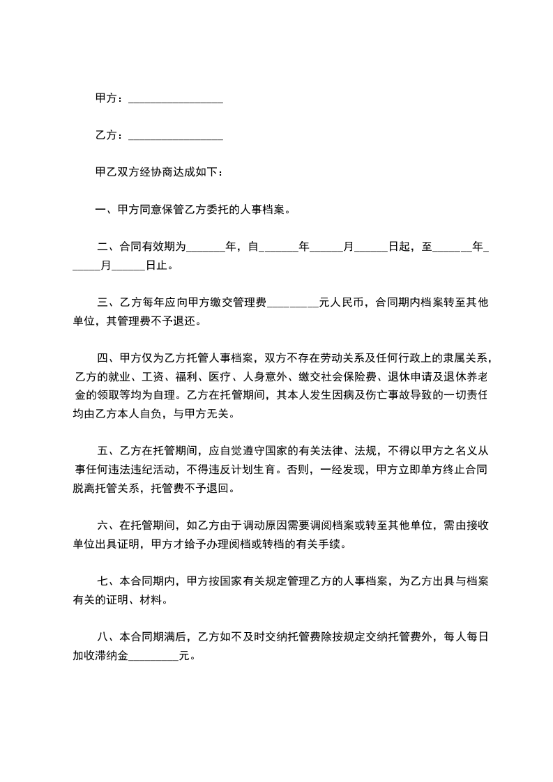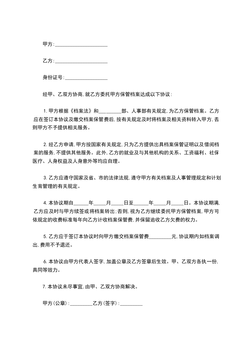5.乙方应于签订本协议时向甲方缴交档案保管费_________元,协议期内如档案调出,费用不予退还。