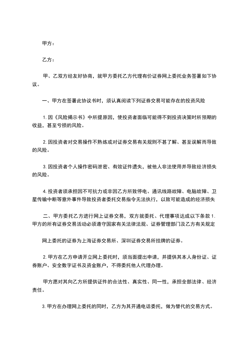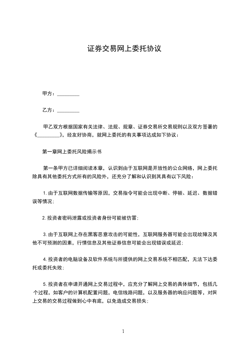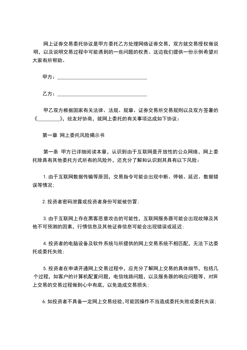 第一条 甲方已详细阅读本章,认识到由于互联网是开放性的公众网络,网上委托除具有其他委托方式所有的风险外,还充分了解和认识到其具有以下风险: