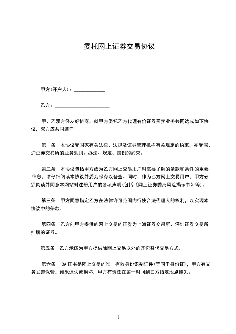 甲乙双方根据国家有关法律、法规、规章、证券交易所交易规则以及双方签署的《_________》,经友好协商,就网上委托的有关事项达成如下协议: