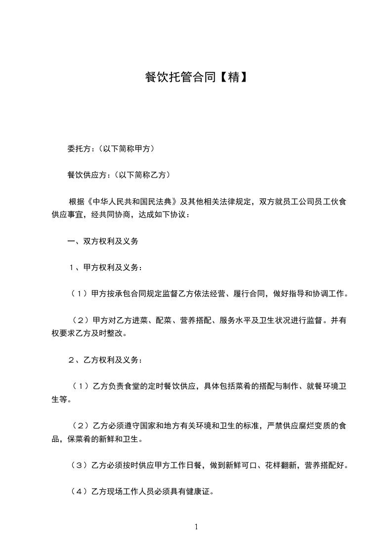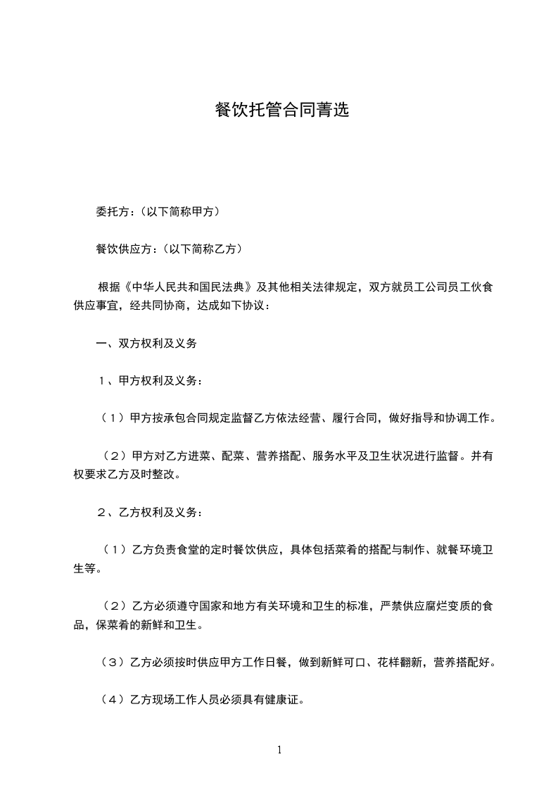 根据《中华人民共和国民法典》及其他相关法律规定,双方就员工公司员工伙食供应事宜,经共同协商,达成如下协议: