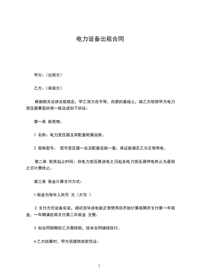 1 甲方负责提供合格的,满足乙方需要的变压器,协议期间内甲方不得允许其他人使用。