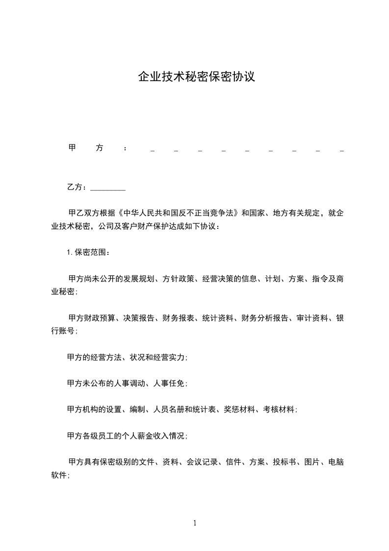 甲乙双方根据《中华人民共和国反不正当竞争法》和国家、地方有关规定,就企业技术秘密,公司及客户财产保护达成如下协议: