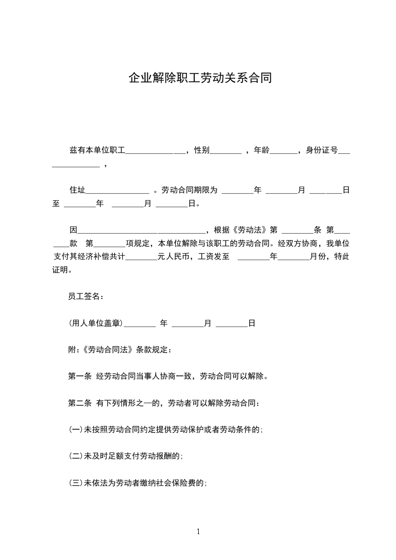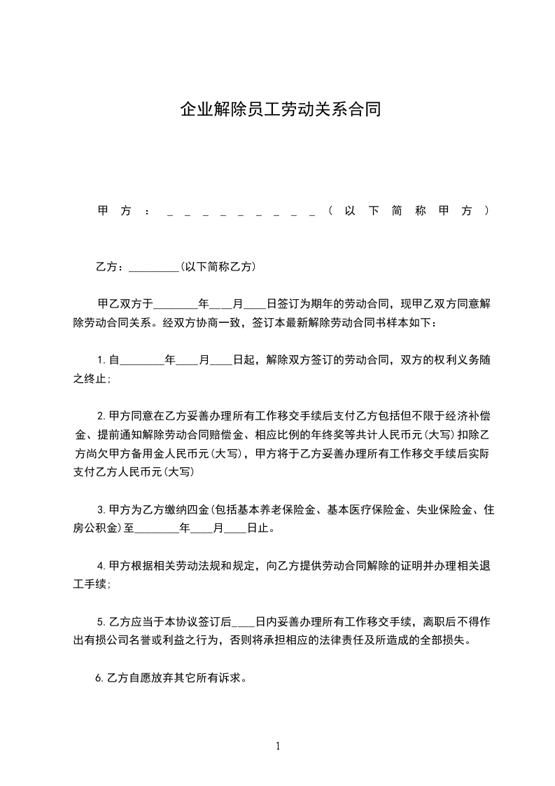一、经甲、乙双方当事人协商一致,从______年____月____日起解除双方的劳动关系。