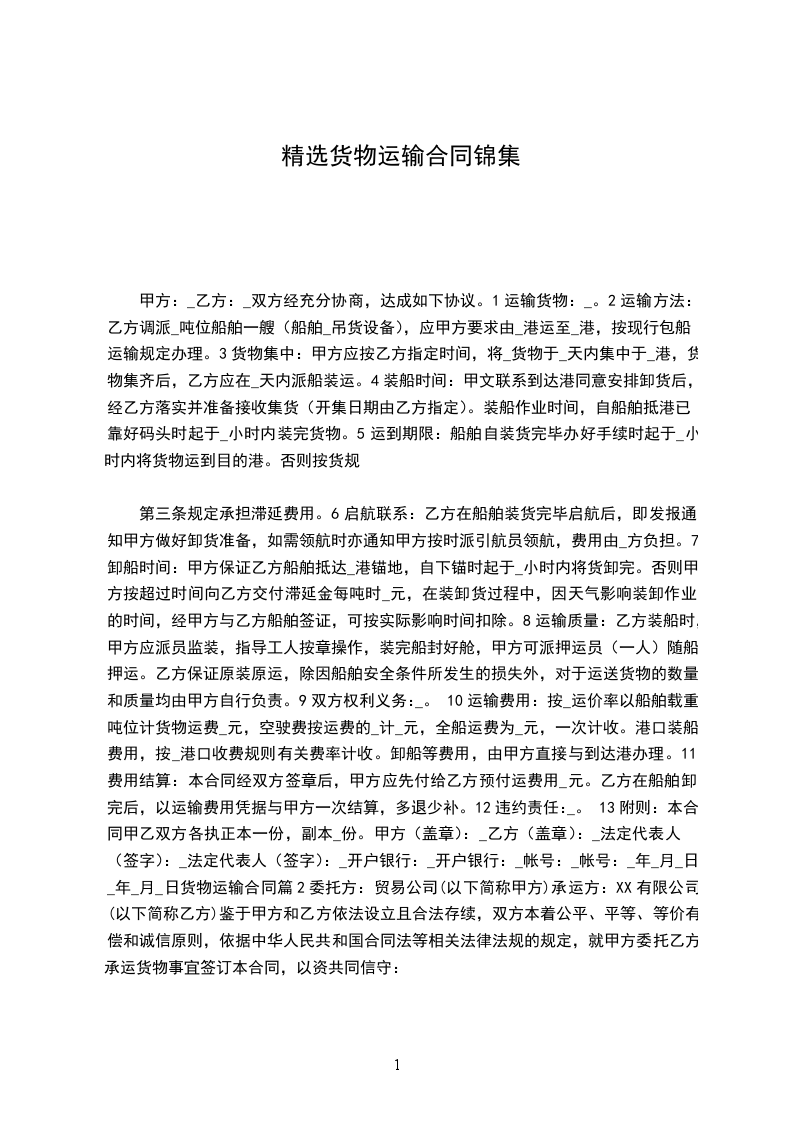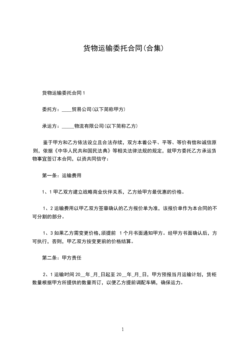 2、1运输时间年_月_日起至年_月_日,甲方预报当月运输计划,货柜数量根据甲方所提供的数量而订,以便乙方提前调配车辆,确保运力。