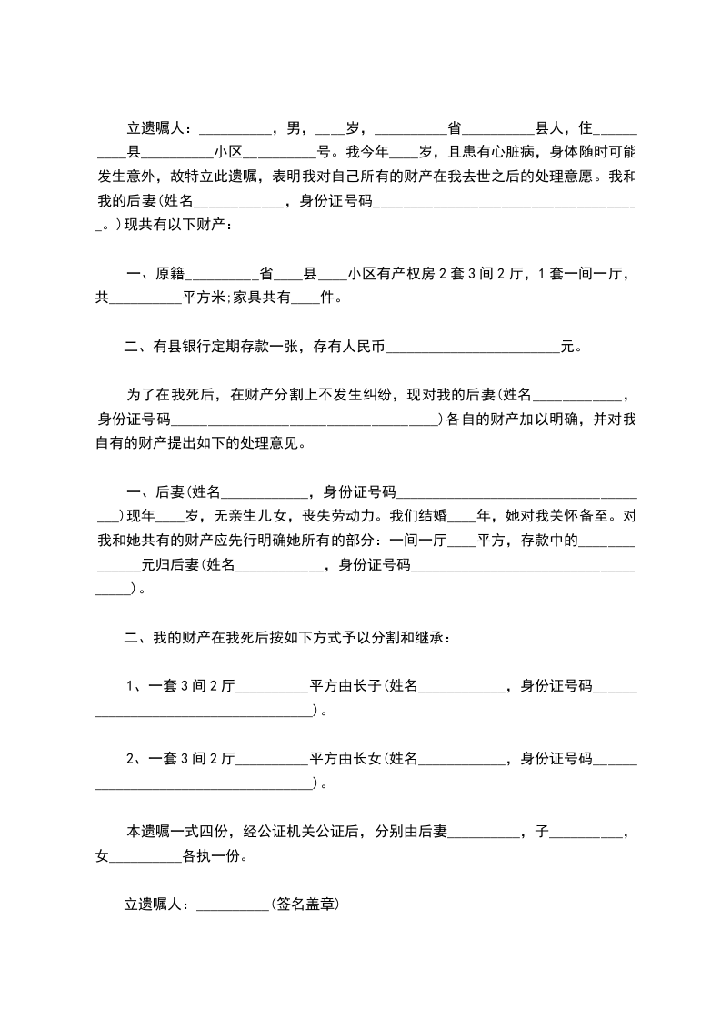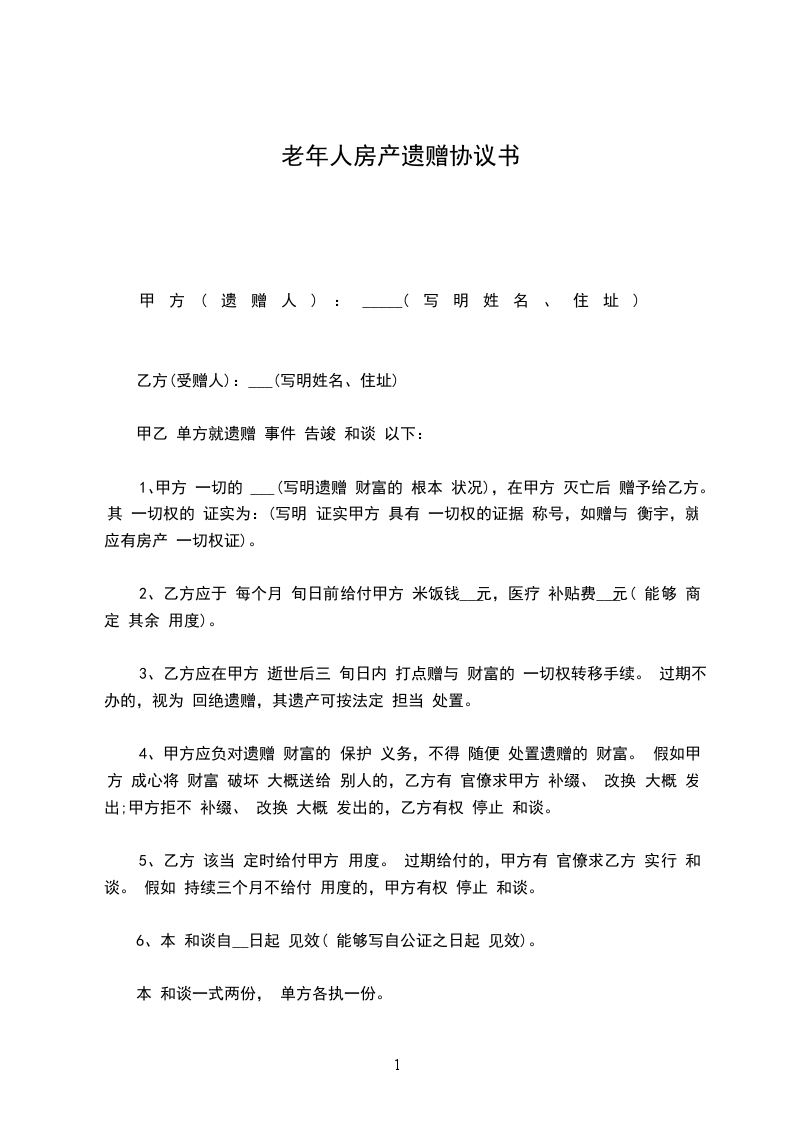 1、甲方 一切的 (写明遗赠 财富的 根本 状况),在甲方 灭亡后 赠予给乙方。其 一切权的 证实为:(写明 证实甲方 具有 一切权的证据 称号,如赠与 衡宇,就应有房产 一切权证)。