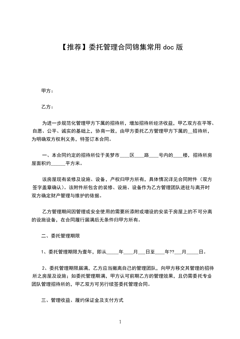 1、本次经营托管服务的期限自甲方托管房屋全部交房之日起3年,交付的具体时间双方确定后签订补充协议,作为本合同附件。