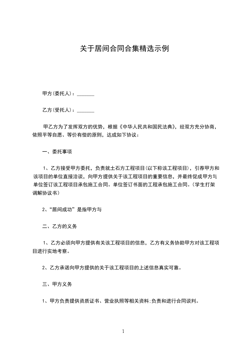 2、如果居间成功,则由甲方全面履行和单位所签订的专业施工单位合同。甲方因履行施工合同而产生的权利和义务,与乙方无关。