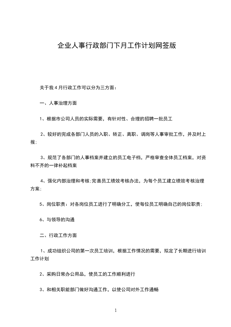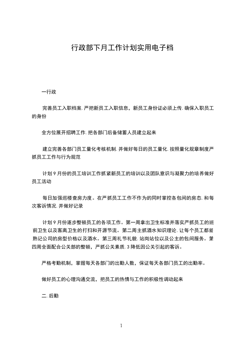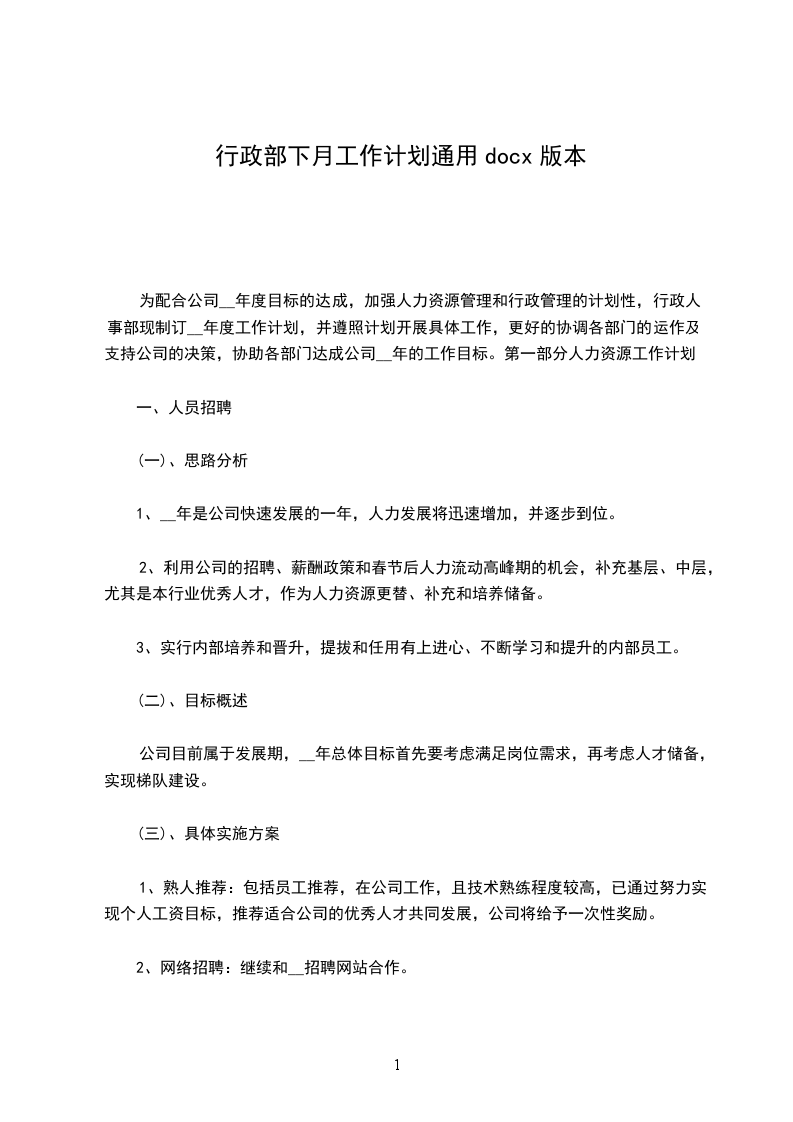 (1)人员招聘:行政部将根据各部门__年度岗位需求情况制定集团年度招聘计划,保证集团日常人员招聘与人员配置。