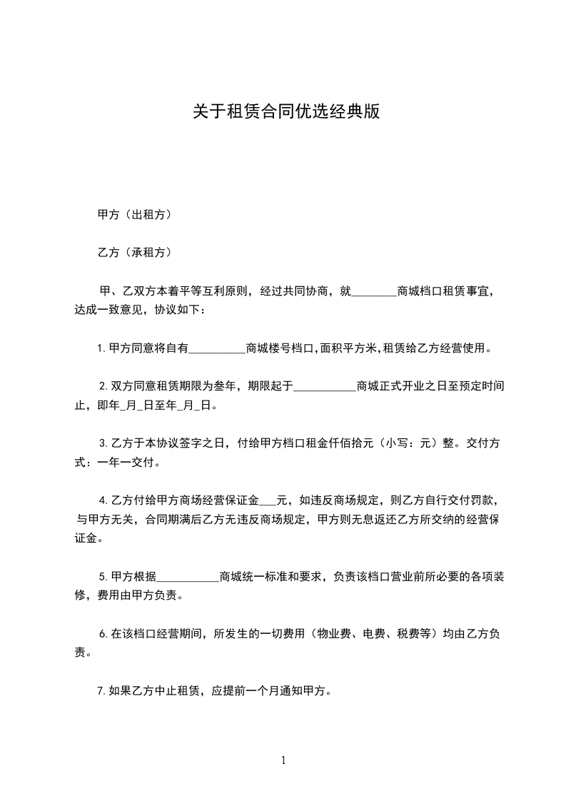 甲、乙双方本着平等互利原则,经过共同协商,就________商城档口租赁事宜,达成一致意见,协议如下: