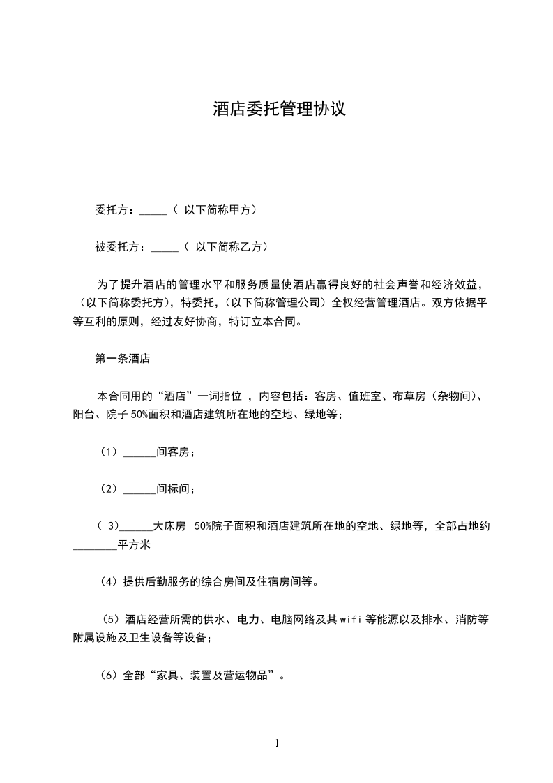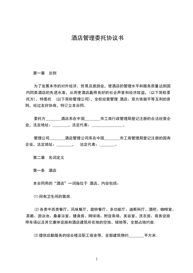 为了发展本市的对外经济、贸易及旅游业,使酒店的管理水平和服务质量达到国内同类酒店的先进水准,从而使酒店赢得良好的社会声誉和经济效益,(以下简称委托方),特委托 (以下简称管理公司),全权经营管理 酒店。双方依据平等互利的原则,经过友好协商,特订立本合同。