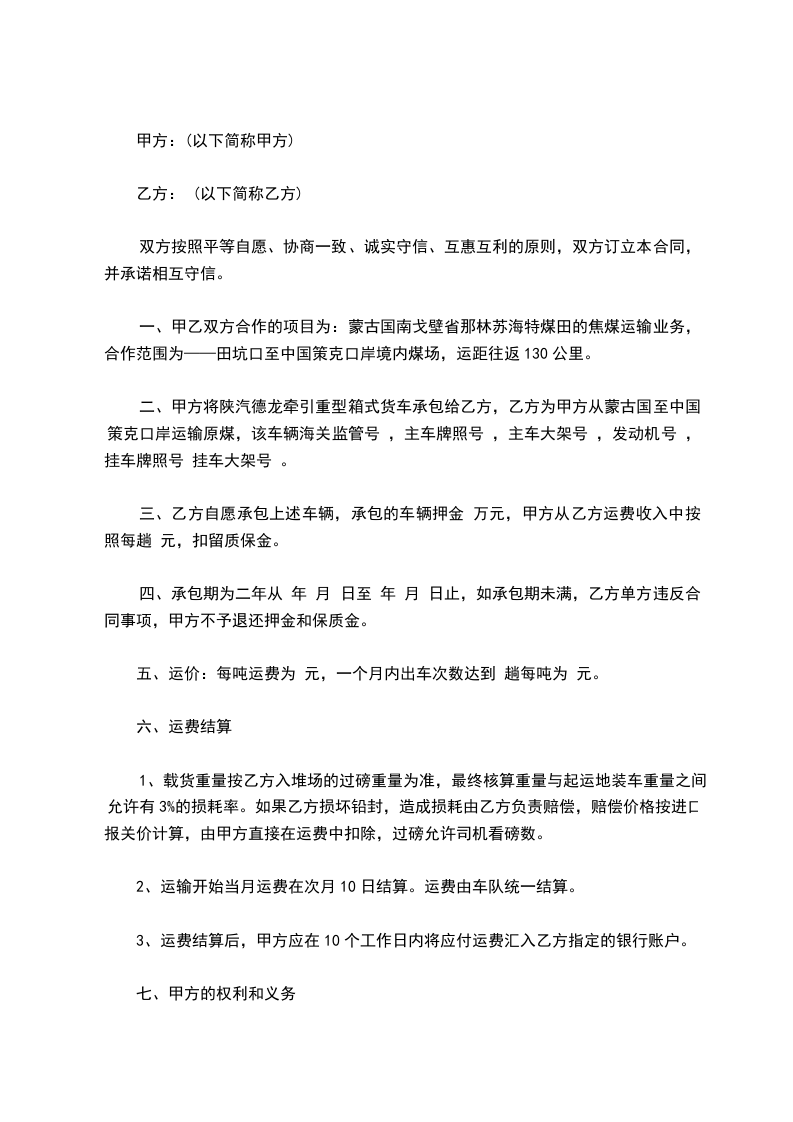 二、甲方将陕汽德龙牵引重型箱式货车承包给乙方,乙方为甲方从蒙古国至中国策克口岸运输原煤,该车辆海关监管号 ,主车牌照号 ,主车大架号 ,发动机号 ,挂车牌照号 挂车大架号 。