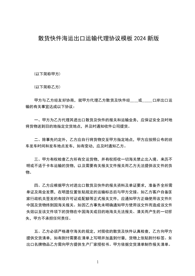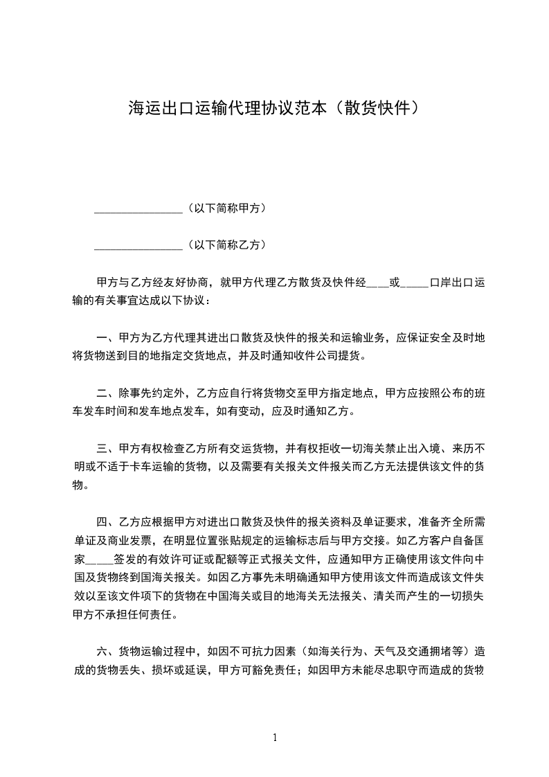 甲方与乙方经友好协商,就甲方代理乙方散货及快件经____或_____口岸出口运输的有关事宜达成以下协议: