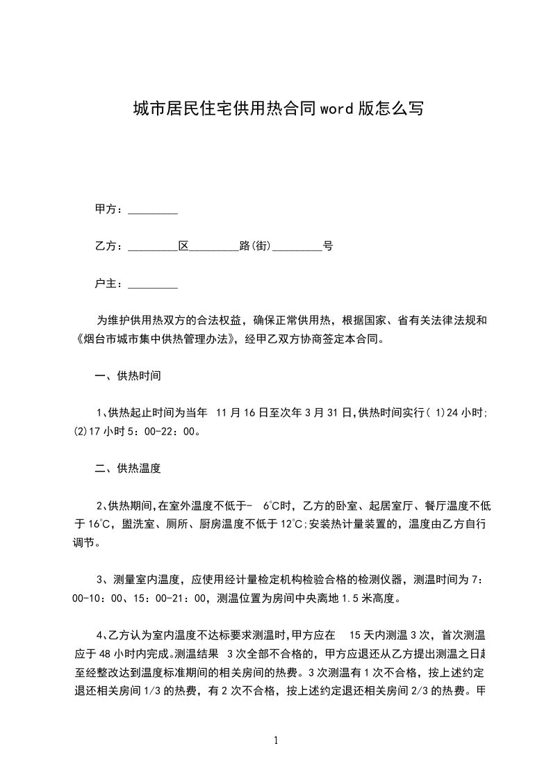 2、供热期间,在室外温度不低于-6℃时,乙方的卧室、起居室厅、餐厅温度不低于16℃,盥洗室、厕所、厨房温度不低于12℃;安装热计量装置的,温度由乙方自行调节。