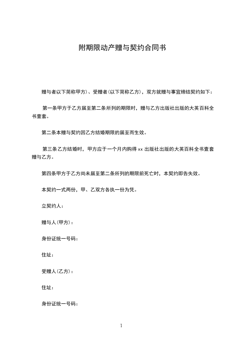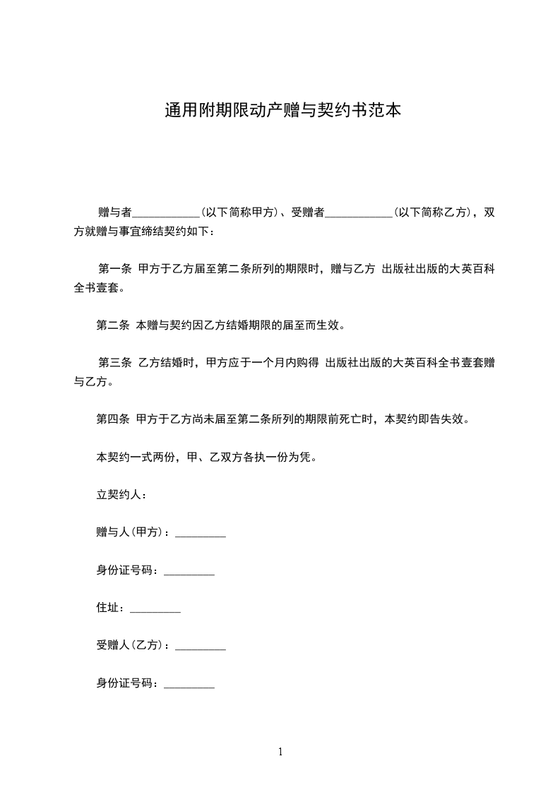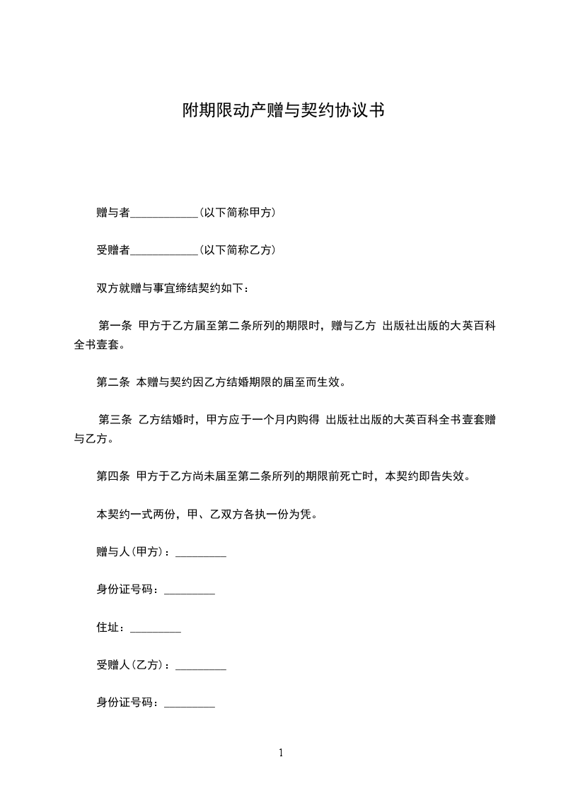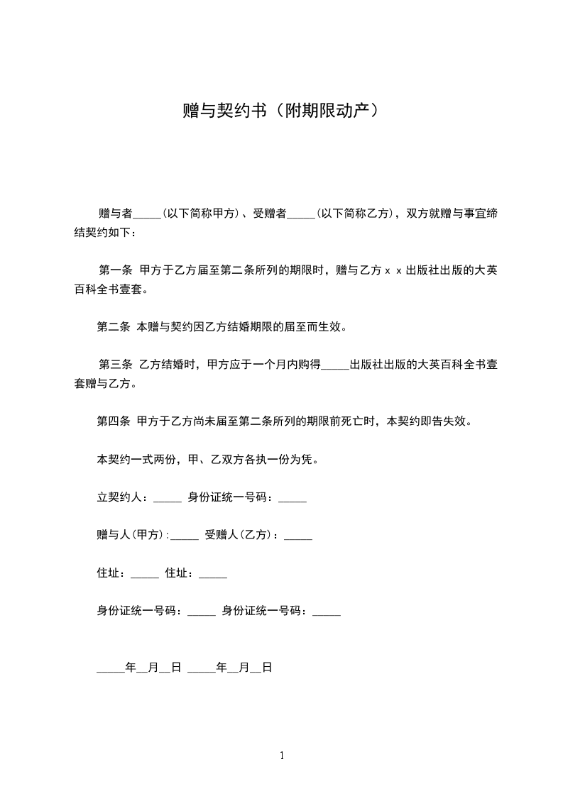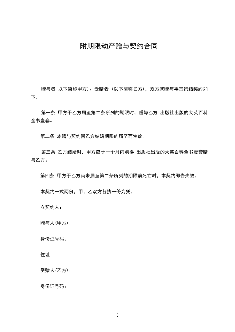 第一条 甲方于乙方届至第二条所列的期限时,赠与乙方 出版社出版的大英百科全书壹套。