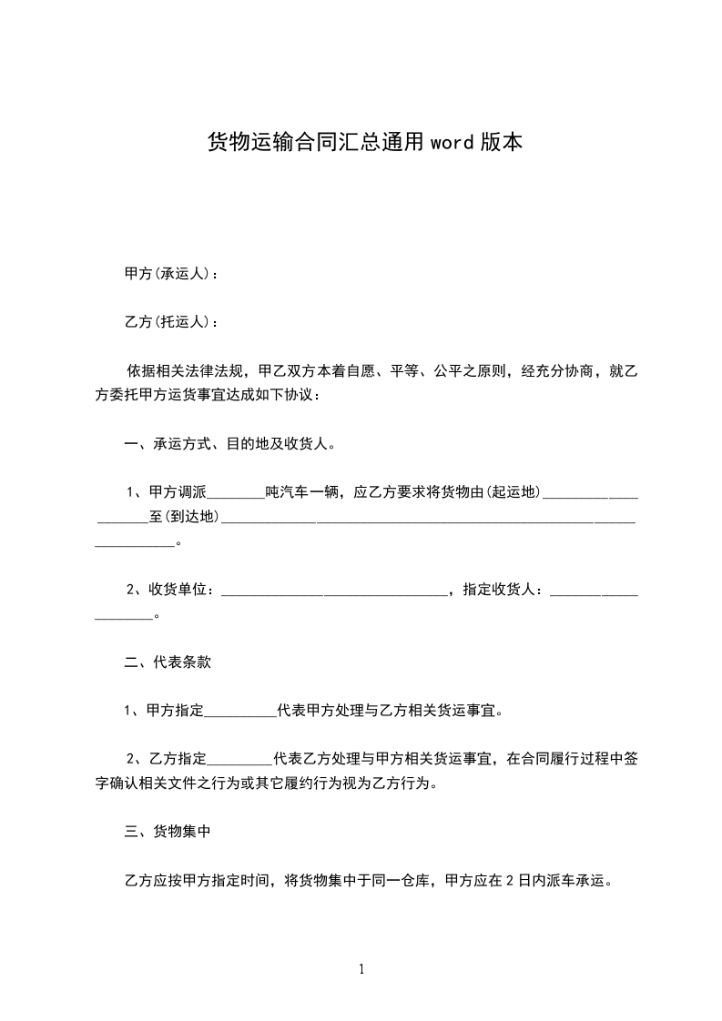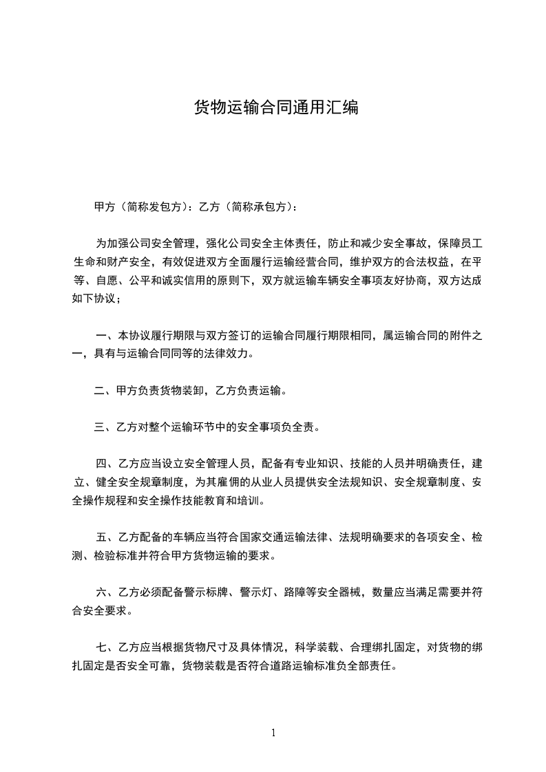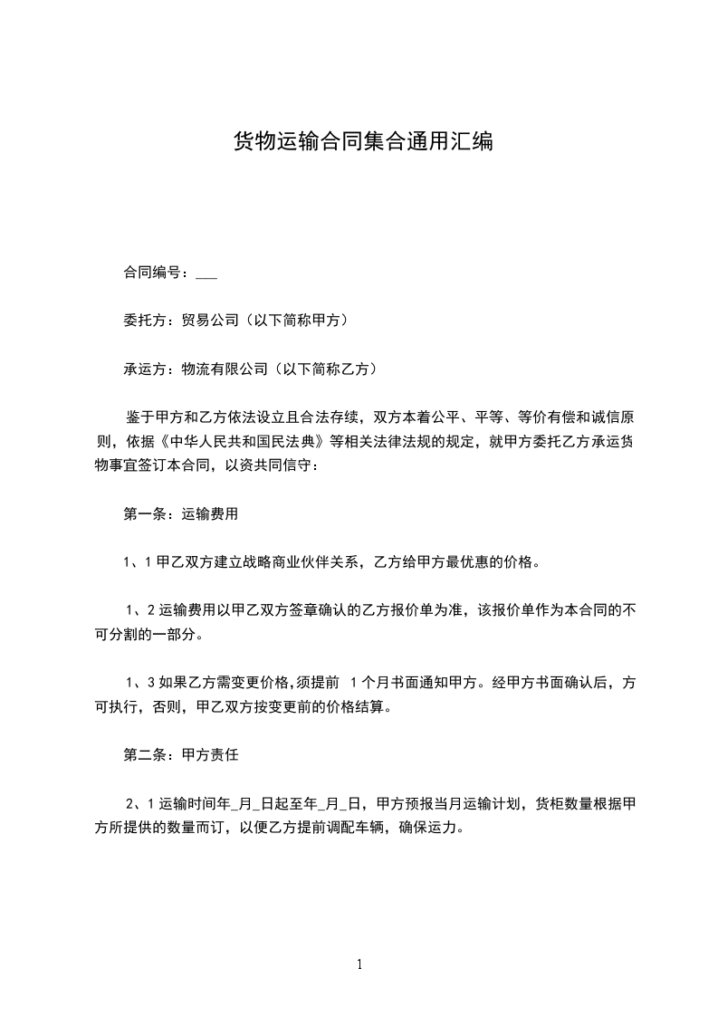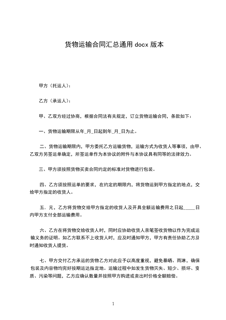 甲、乙双方经过协商,根据合同法有关规定,订立货物运输合同,条款如下: