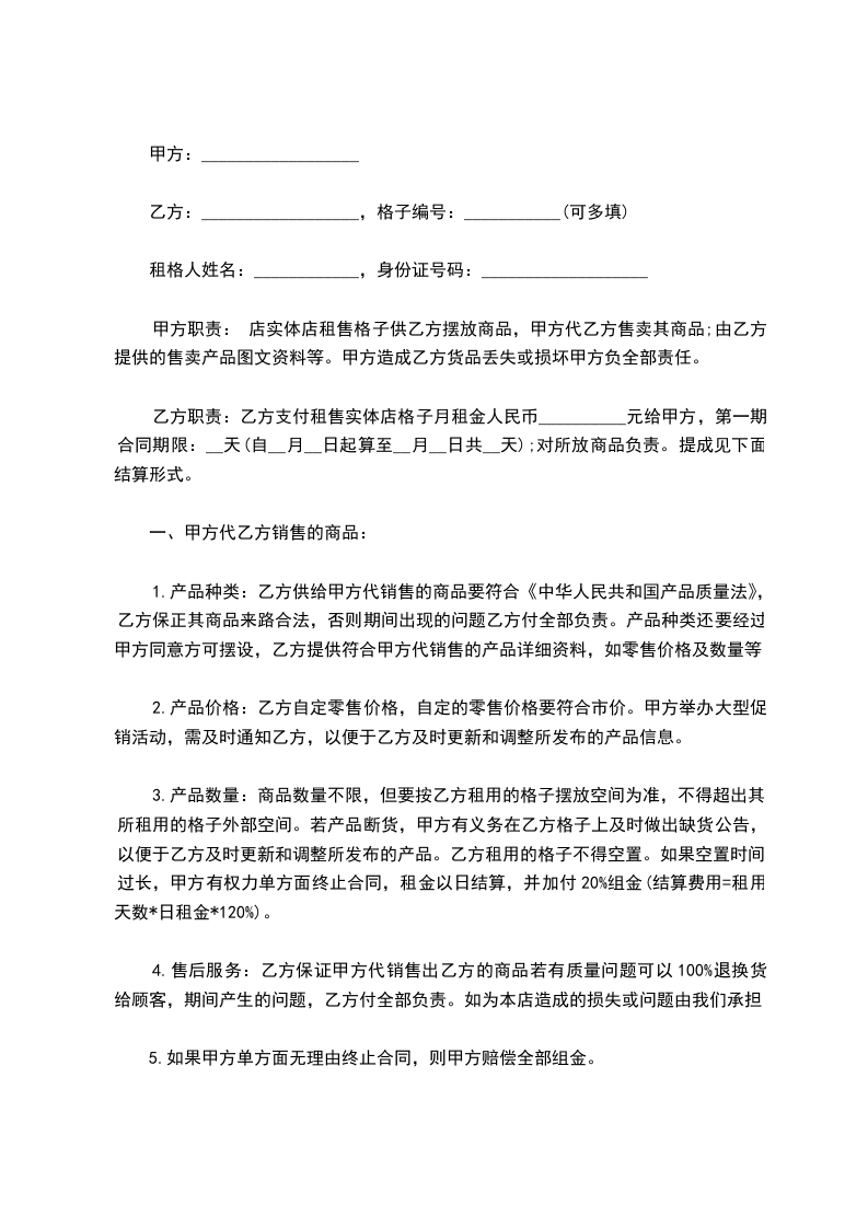 1.格子租金结算:乙方租金以合同期结算形式,乙方要在签订本协议时将80%租金交给甲方,并在合同到期后缴纳剩余租金和5%的商品利润提成。