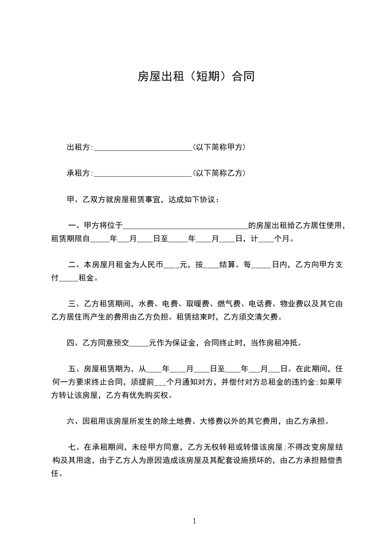 五、房屋租赁期为,从____年____月____日至____年___月___日。在此期间,任何一方要求终止合同,须提前___个月通知对方,并偿付对方总租金的违约金;如果甲方转让该房屋,乙方有优先购买权。