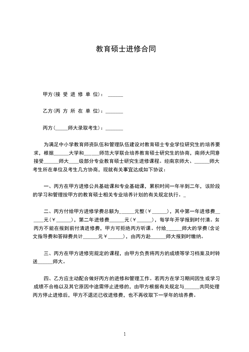 为满足中小学教育师资队伍和管理队伍建设对教育硕士专业学位研究生的培养要求,根据______大学和______师范大学联合培养教育硕士研究生的协商,南师大同意接受______师大____级部分专业教育硕士研究生进修课程。经南京师大、______师大、考生所在单位及考生几方协商,现就有关事宜达成如下协议: