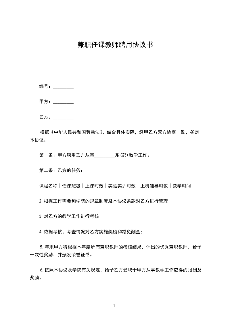 第一条:甲方聘用乙方从事_________系(部)教学工作。