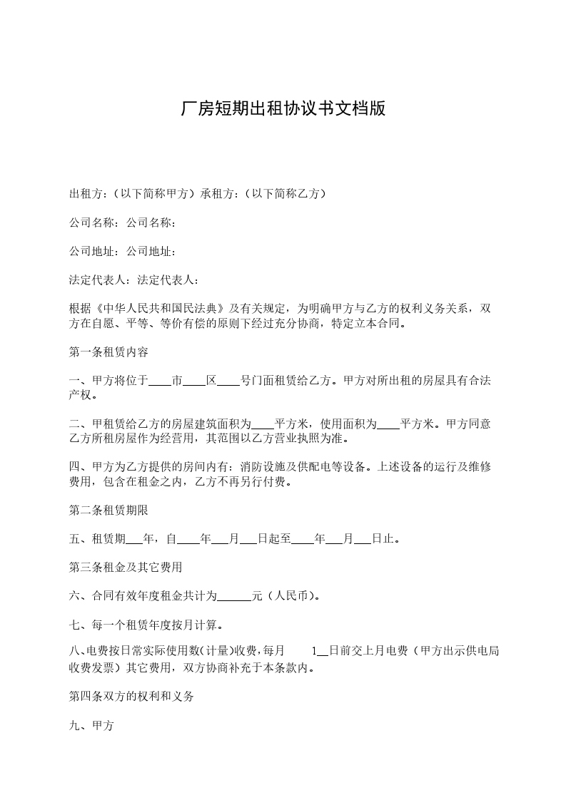 出租方愿意将产权(或管理权)属于自己的厂房出租给承租方,双方依据《中华人民共和国民法典》、当地政府对厂房租赁的有关规定的规定,为明确出租方与承租方的权利义务关系,在平等、自愿、公平和诚实信用的基础上经过充分协商,就租赁厂房一事达成以下协议,以约束双方行为,以便双方共同遵守。