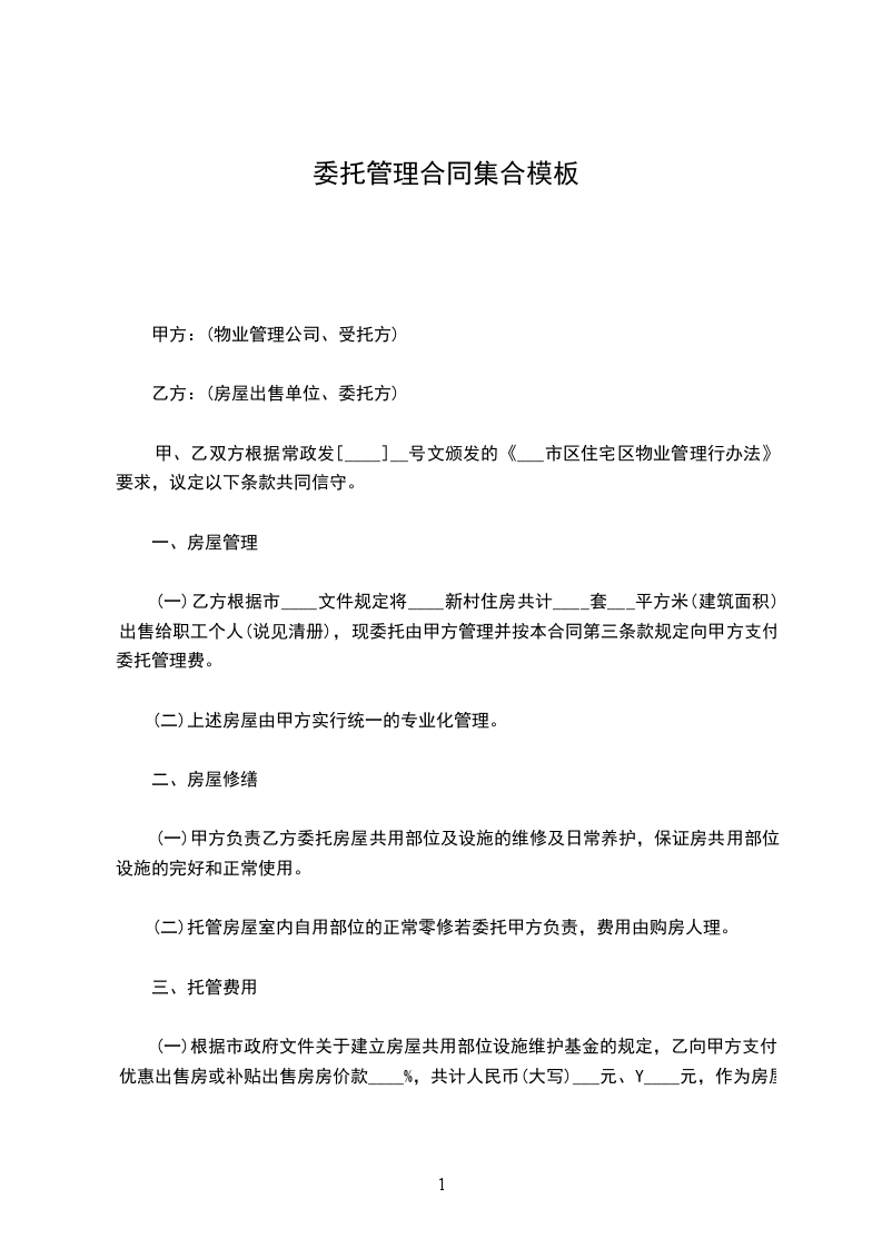 (一)乙方根据市____文件规定将____新村住房共计____套___平方米(建筑面积)出售给职工个人(说见清册),现委托由甲方管理并按本合同第三条款规定向甲方支付委托管理费。