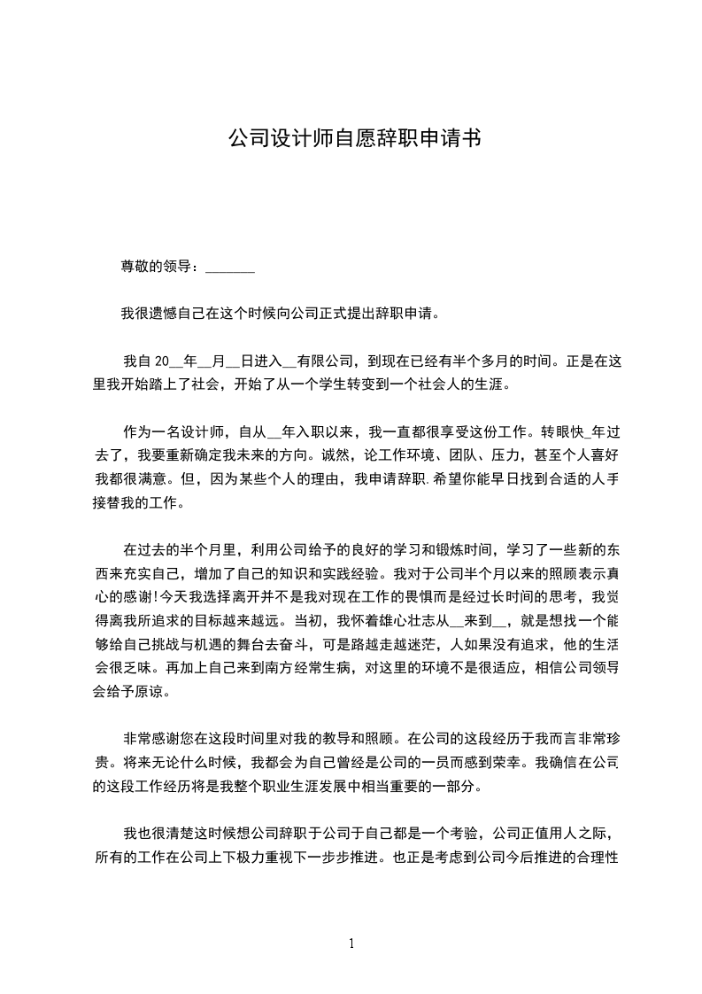 作为一名设计师,自从××年入职以来,我一直都很享受这份工作。转眼快×年过去了,我要重新确定我未来的方向。诚然,论工作环境、团队、压力,甚至个人喜好,我都很满意。但,因为某些个人的理由,我申请辞职.希望你能早日找到合适的人手接替我的工作。