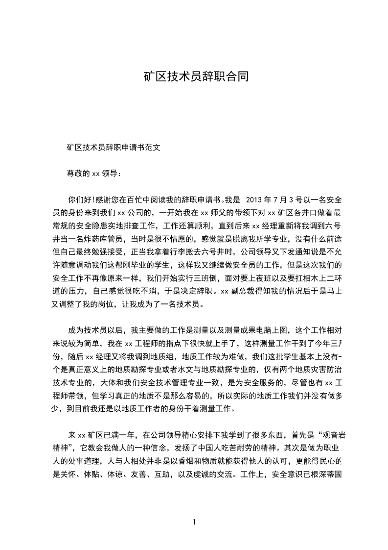 矿区技术员辞职申请书范文