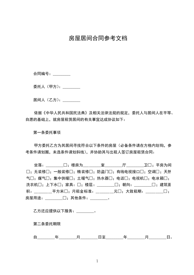 甲方委托乙方为其居间寻找符合以下条件的房屋(必备条件请在方格内划钩,参考条件请划圈,未选条件请划斜线),并协助其与出租人签订房屋租赁合同: