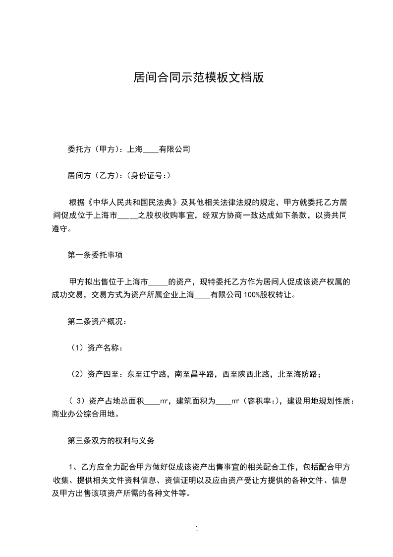 根据《中华人民共和国民法典》及其他相关法律法规的规定,甲方就委托乙方居间促成位于上海市_____之股权收购事宜,经双方协商一致达成如下条款,以资共同遵守。