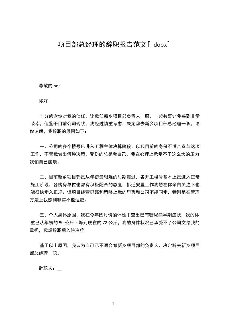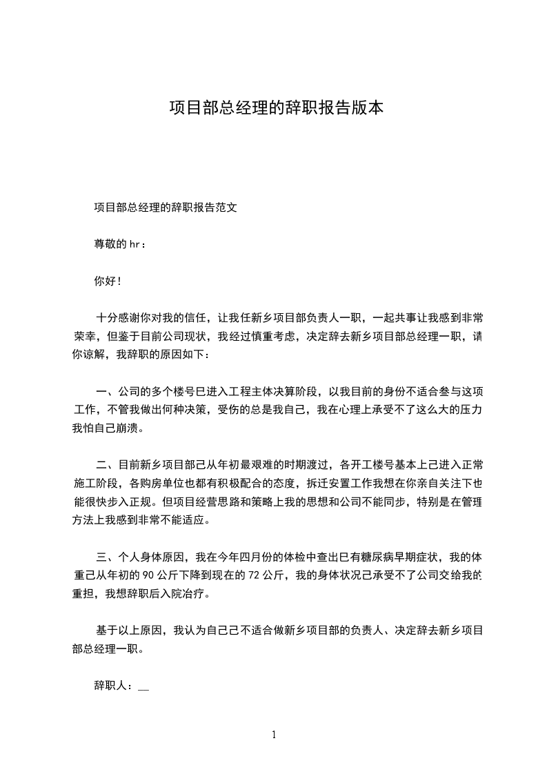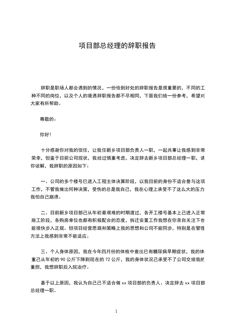 十分感谢你对我的信任,让我任新乡项目部负责人一职,一起共事让我感到非常荣幸,但鉴于目前公司现状,我经过慎重考虑,决定辞去新乡项目部总经理一职,请你谅解,我辞职的原因如下: