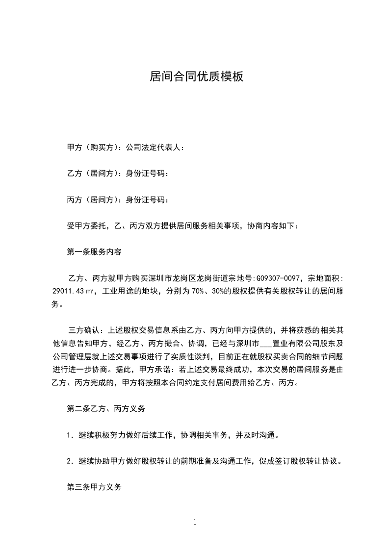 乙方、丙方就甲方购买深圳市龙岗区龙岗街道宗地号:G09307-0097,宗地面积:29011.43㎡,工业用途的地块,分别为70%、30%的股权提供有关股权转让的居间服务。